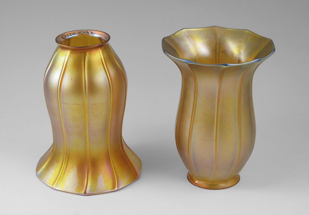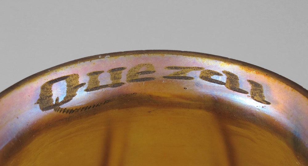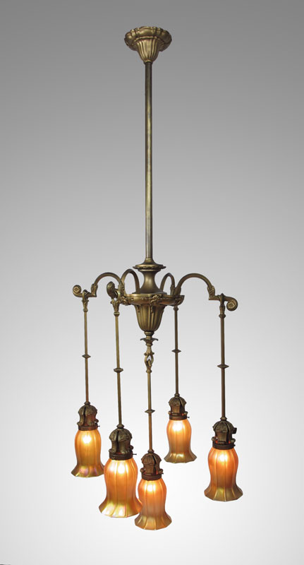 QUEZAL 5 LIGHT CHANDELIER: 5 drop light cast metal chandelier with signed Quezal shades. Each shade 6'' h. x 4 1/2'' with a 2 1/4'' fitter rim. Overall 57'' 1/2 h. including down rod x 20 1/2'' dia.