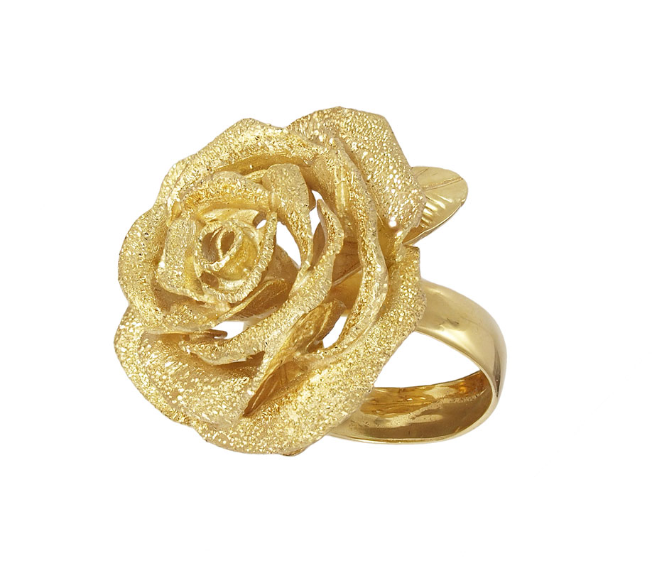 14K ROSE RING: Hand crafted Italian 14K yellow gold ring depicting a rose. Weight: 11.0 grams. Size: 7