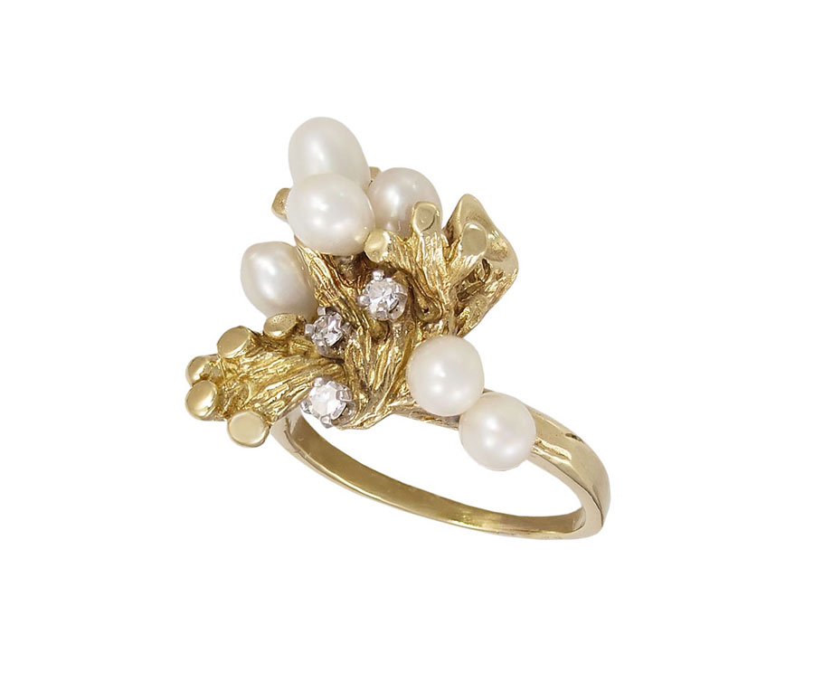 18K PEARL & DIAMOND RING: 18K yellow gold ring contains 3 round single cut diamonds totaling approx. .12 Ct., VS in clarity and H-I in color, and six drop shaped cultured pearls. Weight: 8.9 grams. Size: 8