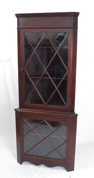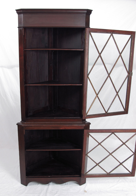 MAHOGANY STRING INLAID CORNER CABINET: Top section with 2 wood shelves, lower section with single shelf. 76'' h. x 31 1/2'' x 18''.