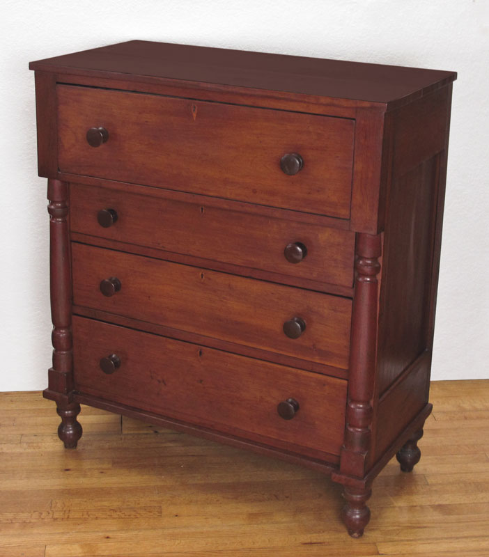 19TH C AMERICAN COUNTRY CHEST OF DRAWERS: Overhanging top drawer over 3 drawers. Approx. 48''h. x 42'' x 21''.