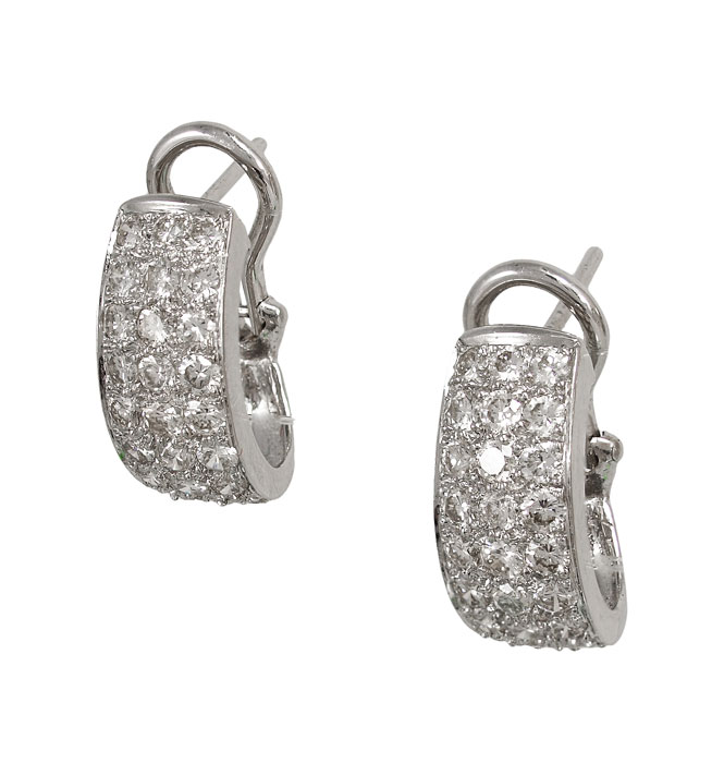 18K DIAMOND EARRINGS: 18K white gold earrings contain 48 round brilliant cut diamonds. Weight: 1.50 Ct. Approx. Rated VS in clarity and G-H in color. The diamonds are pave set. Post and hinged clip closures. Weight: 6.3 grams.