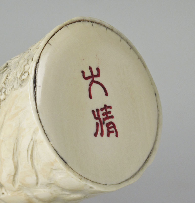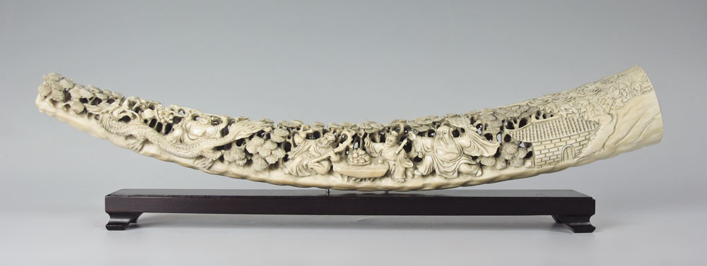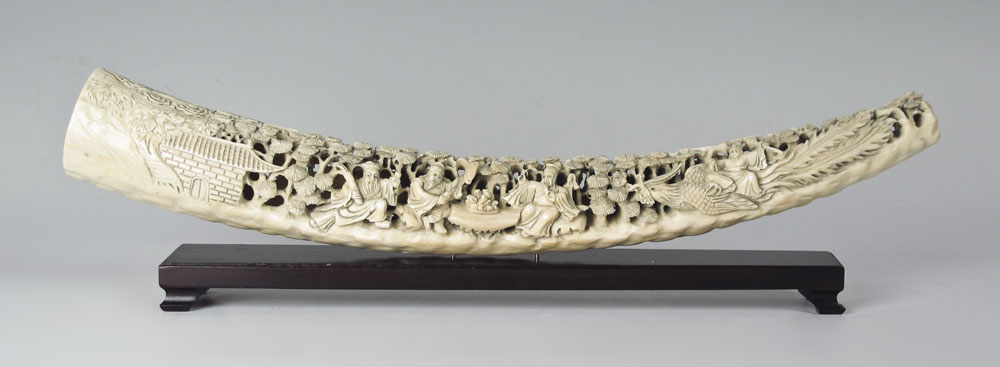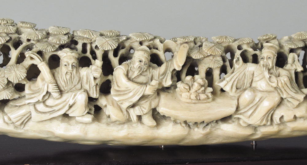 CARVED IVORY TUSK: Highly detailed carved ivory tusk depicting Wise Men in a Ming tree forest, 21''l.