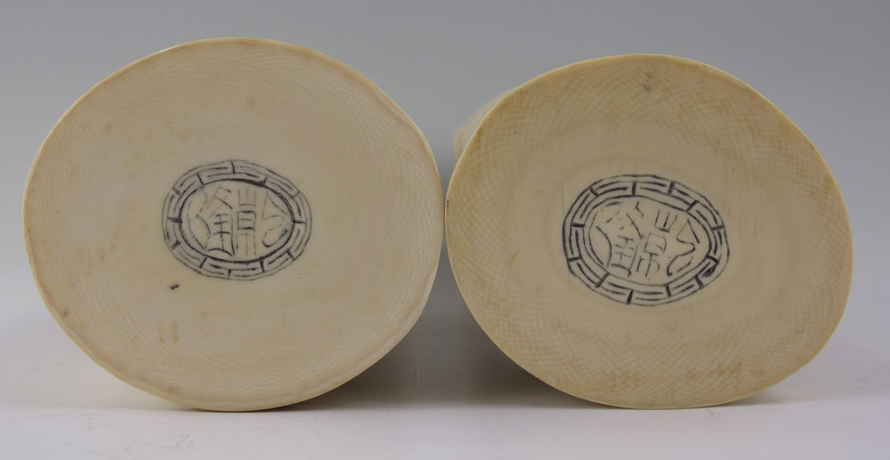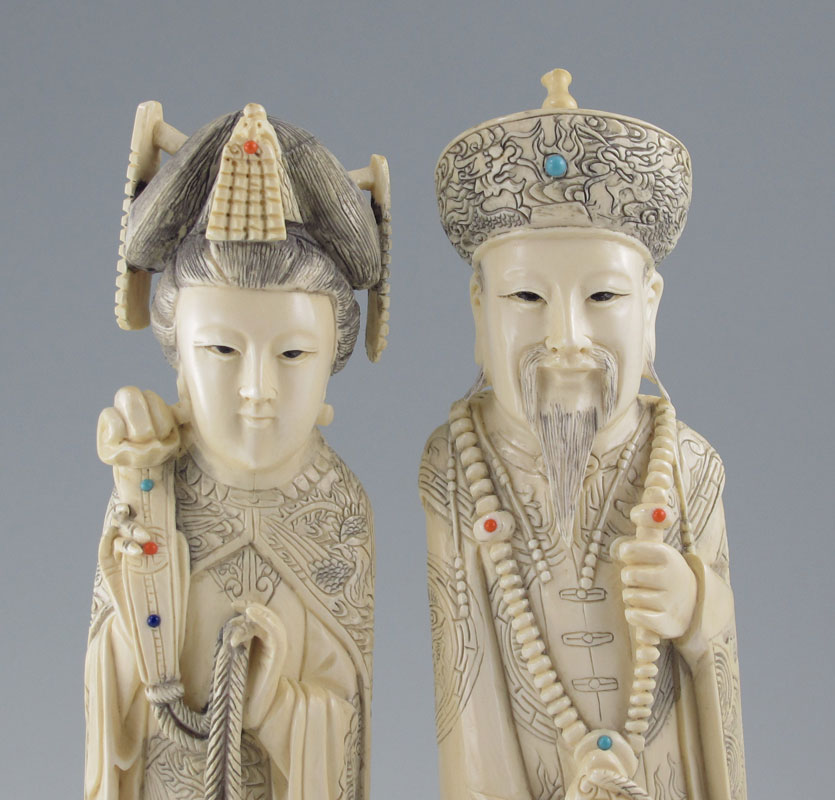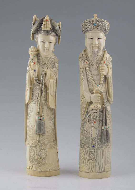 CARVED IVORY KING AND QUEEN TUSKS: To include 1) King with sword and cabochon set beads. 12 1/4'' h. Sold with presentation box, 4 3/4'' x 14 1/2'' x 5 1/2''. 2) Queen with staff and tassels, cabochon set beads, 12'' h. No box with queen.
