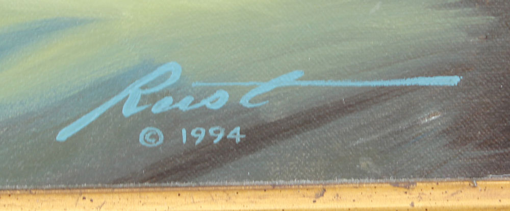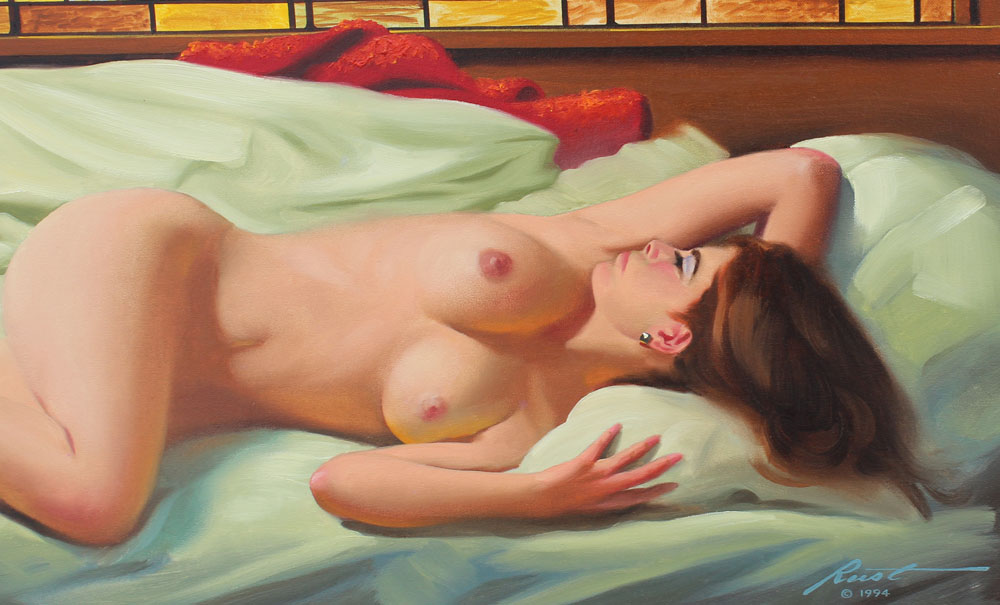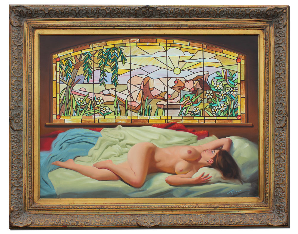 RUST, Donald, (American, 1932-): Female Nude Reclining Beneath a Stained Glass Window with Same Design, OIL/Canvas, 30'' x 40'', signed lower right, dated 1994, encased in a gold frame with wear, 40'' x 50 1/2''.
