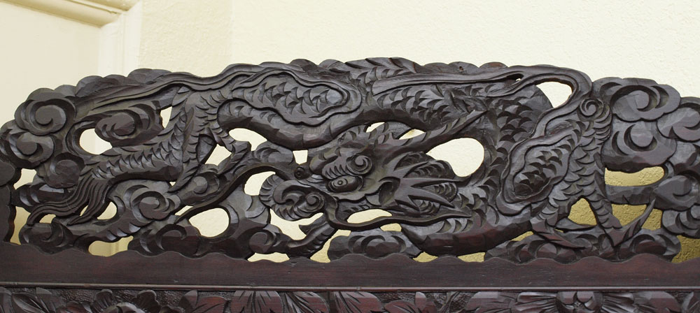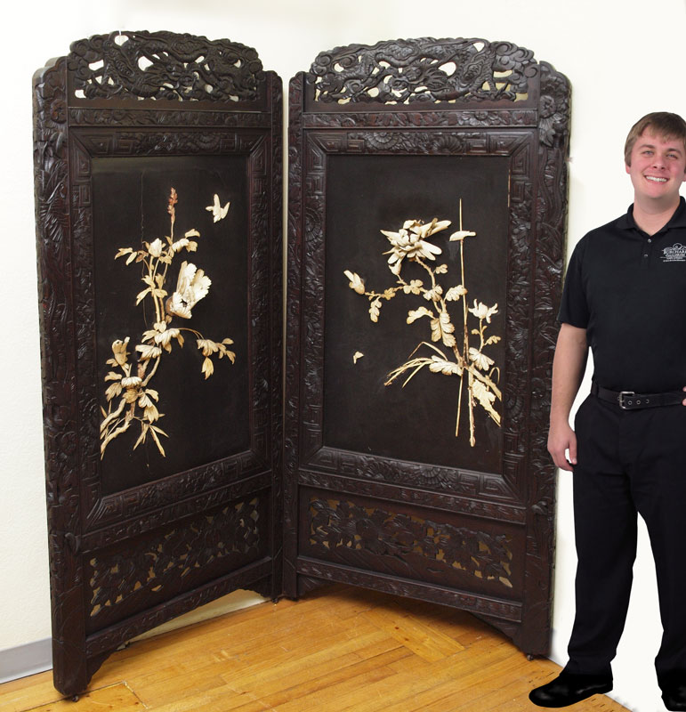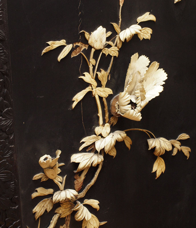 TWO CHINESE CARVED PANELS WITH APPLIED BONE: Elaborate carvings frame lacquered panels with applied bone flowers. Early 20th C. 75'' h. x 36'' wide. Please note loss of bones sections and general wear.