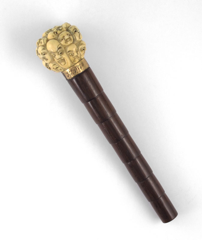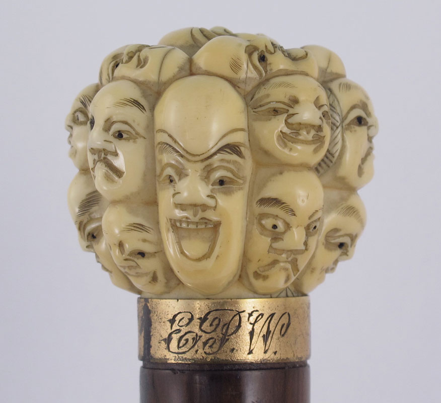 CARVED THOUSAND FACES IVORY CANE HANDLE: Carved ivory handle with One Thousand Faces motif over gold plated collar, monogrammed, wood handle. Measures 7 7/8'' l. x 1 1/2''.