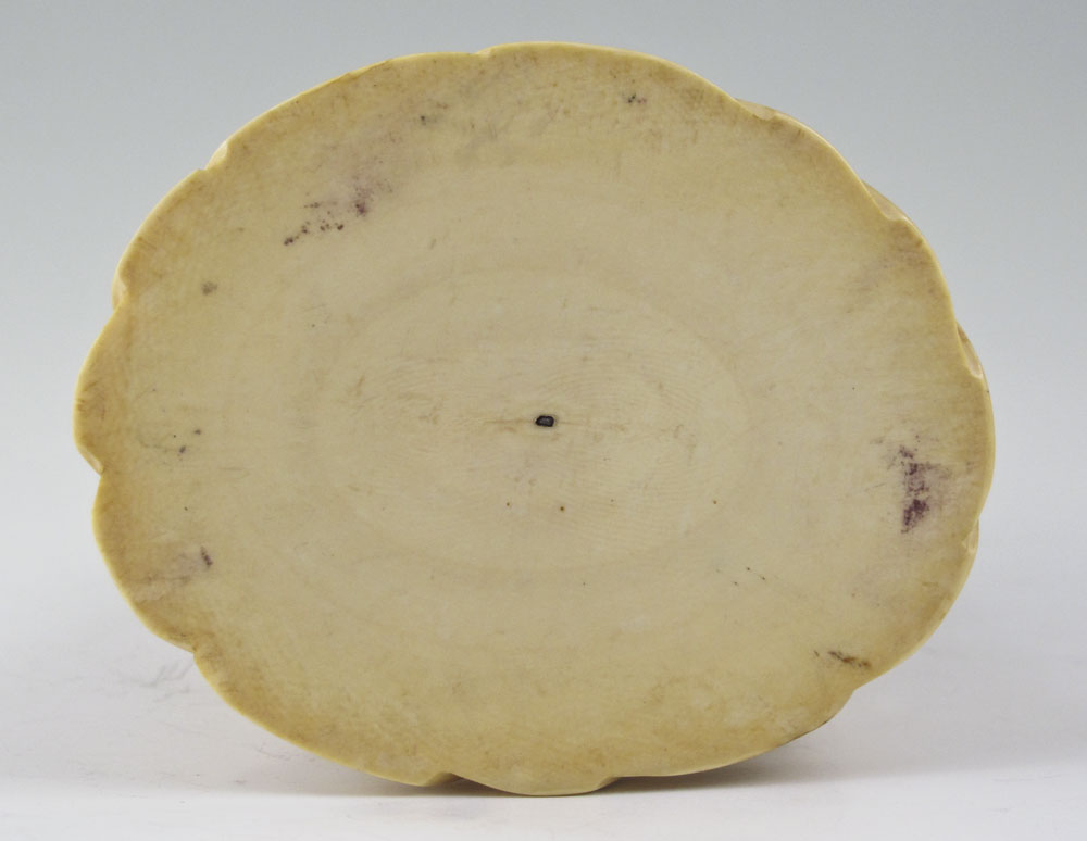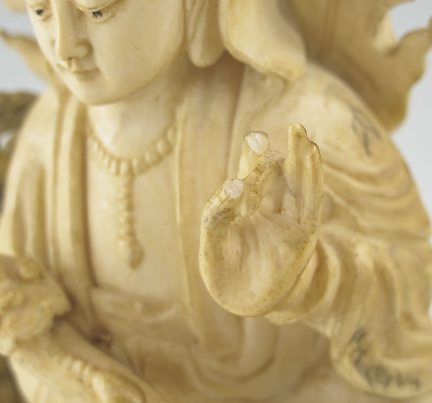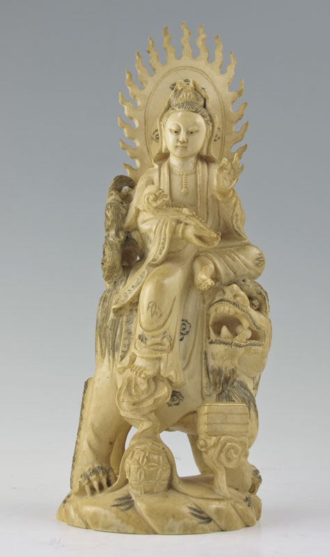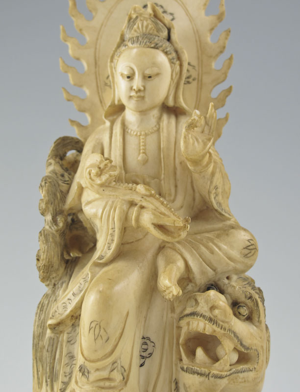 CARVED IVORY FIGURE OF QUANYIN: 20th c. inked ivory statue of Quanyin, Goddess of Mercy Bodhisattiva on her lion vehicle; she holds a scepter books rest on a platform, and she is seated in a pose of Royal Ease.