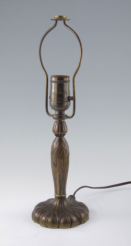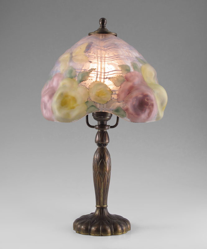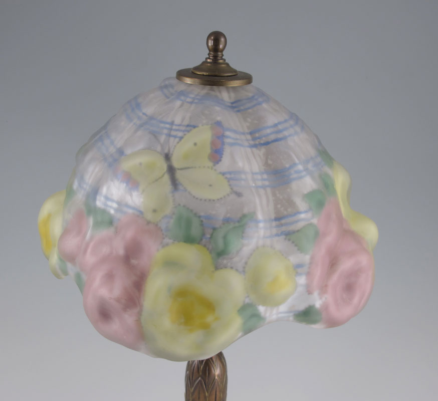 PAIRPOINT PUFFY SHADE BOUDOIR LAMP C3064: Reverse painted puffy flower shade. Lamp measures approx. 14'' tall overall, shade 8'' dia. Bronzed base signed with the Pairpoint logo and number C3064.