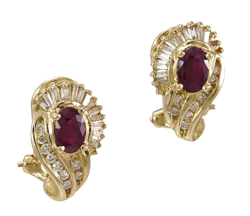 14K RUBY AND DIAMOND EARRINGS: 14K yellow gold earrings contain 18 round brilliant cut diamonds and 26 baguette cut diamonds. Weight: .60 Ct. Approx. Rated SI in clarity and H-I in color. Two oval mixed cut rubies. Weight: 1.40 Ct. Approx. I1 in clarity, stpR in Hue, 5 in Tone and 3-4 in Saturation. The diamonds and rubies are prong set. Post and hinged clip closures. Weight: 5.6 grams