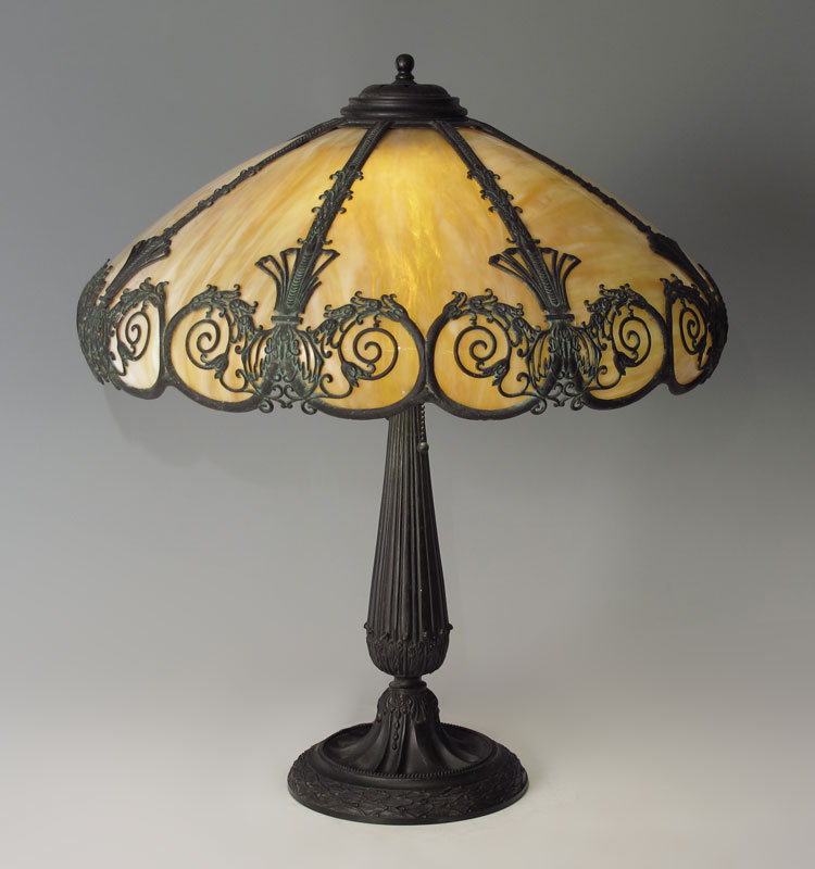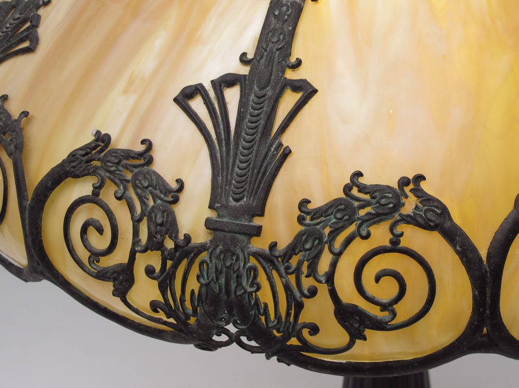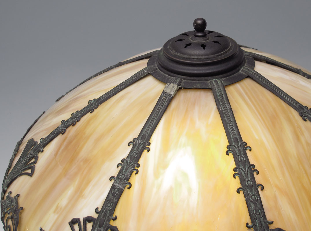VINTAGE SLAG GLASS TABLE LAMP: 8 bent panel, slag glass shade with intricate metal filigree. Bronzed metal base. Double socket, pull chain. Lamp measures 24'' tall overall, shade 19'' dia.