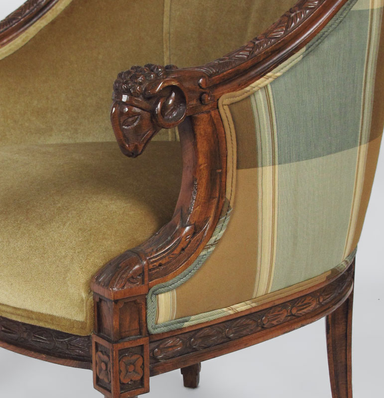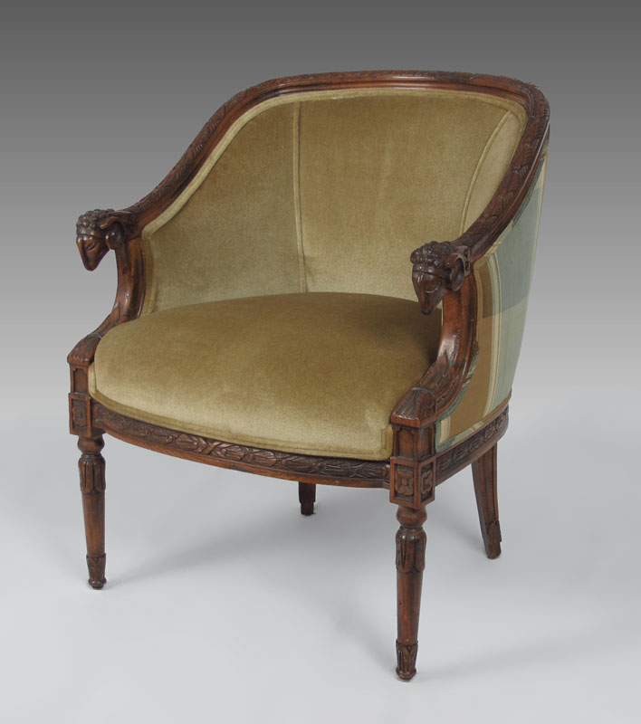CARVED RAMS HEAD CHAIR: Curved and carved continuous top rail ending in ram's head hand holds. Approx. 35''h. x 26'' x 35''.