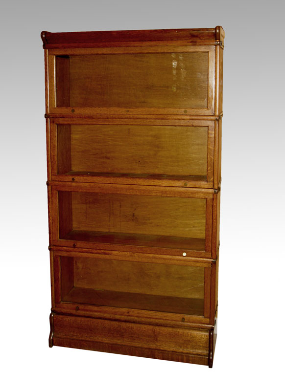 GLOBE WERNICKE OAK BARRISTER BOOKCASE: 4 stack plus base and top, marked on top section. 62 1/2'' h. x 34 1/4'' x 11''.