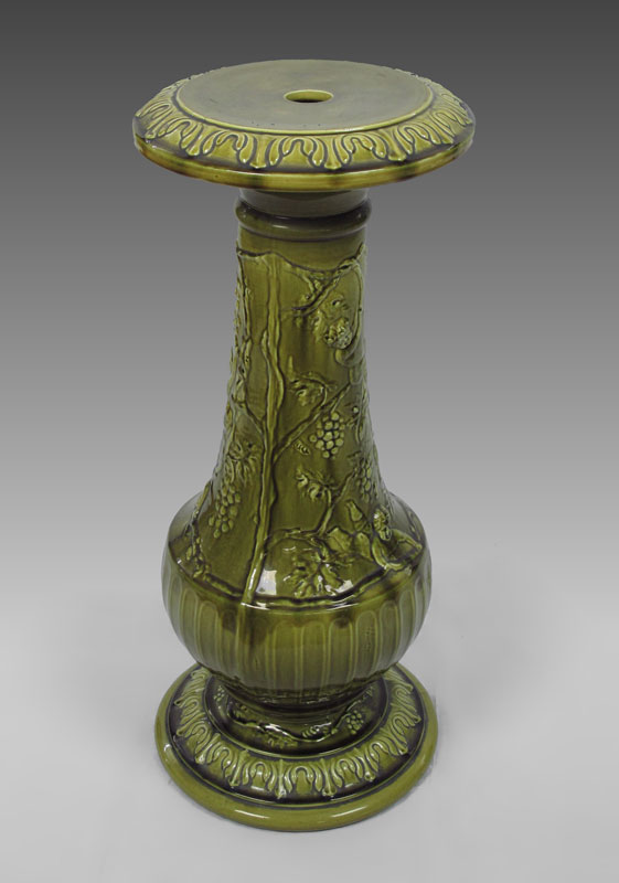 MAJOLICA PEDESTAL STAND: Green majolica glaze, approx. 29'' tall, 13'' dia.
