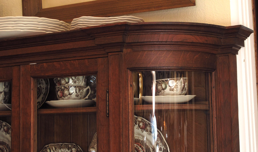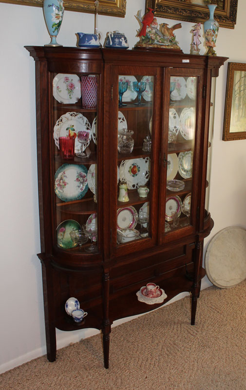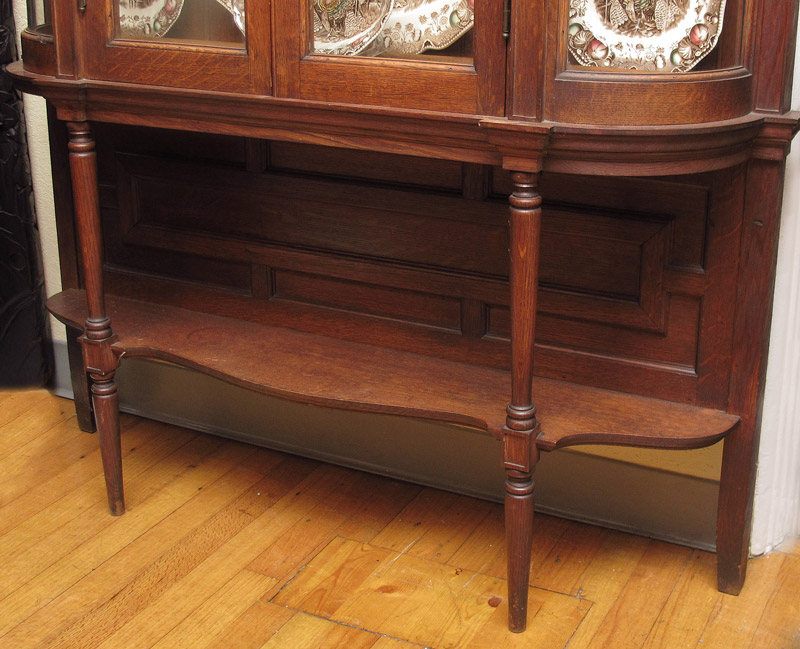 OAK CHINA DISPLAY CABINET: Top section with bowed side glass, 3 wood shelves with plate rails. Lower shelf with carved back panel, turned front legs. 61 1/4'' h. x 46'' x 11 1/4''.