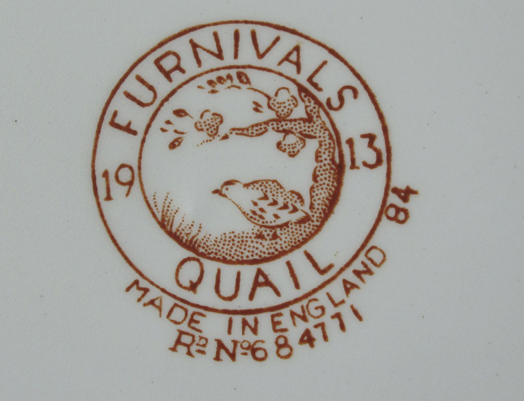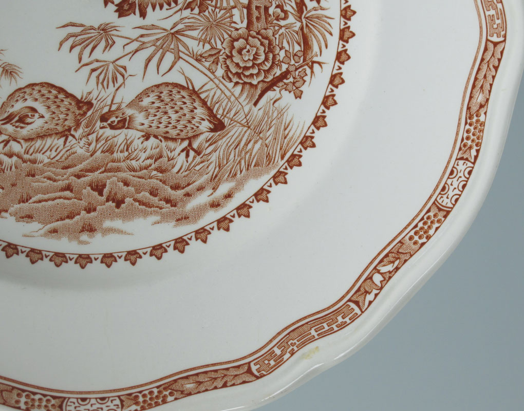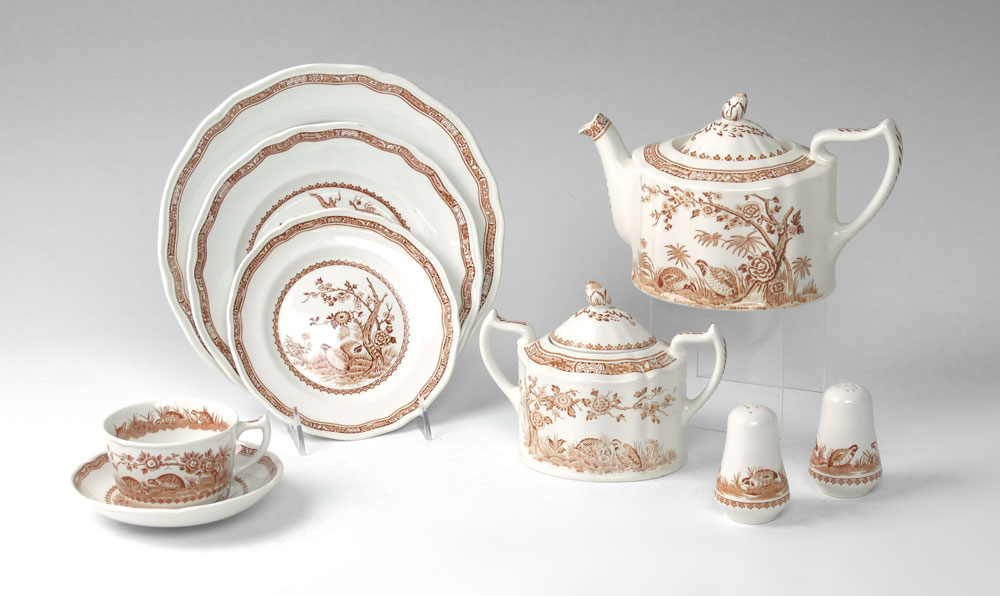 MASON'S FURNIVALS QUAIL PATTERN CHINA SERVICE: Approx. 65 pieces in the Furnivals Quail pattern by Mason's Ironstone to include 9 plates (10 1/2''), 12 salad, 11 bread, 12 teacups, 12 saucers, teapot (5 1/2'' x 9 1/4'') note chip to interior rim, covered sugar, gravy boat, salt and pepper, 2 serving bowls, square covered vegetable (6 1/2'' x 9 1/2''), 2 platters (10'' x 13 1/2'').