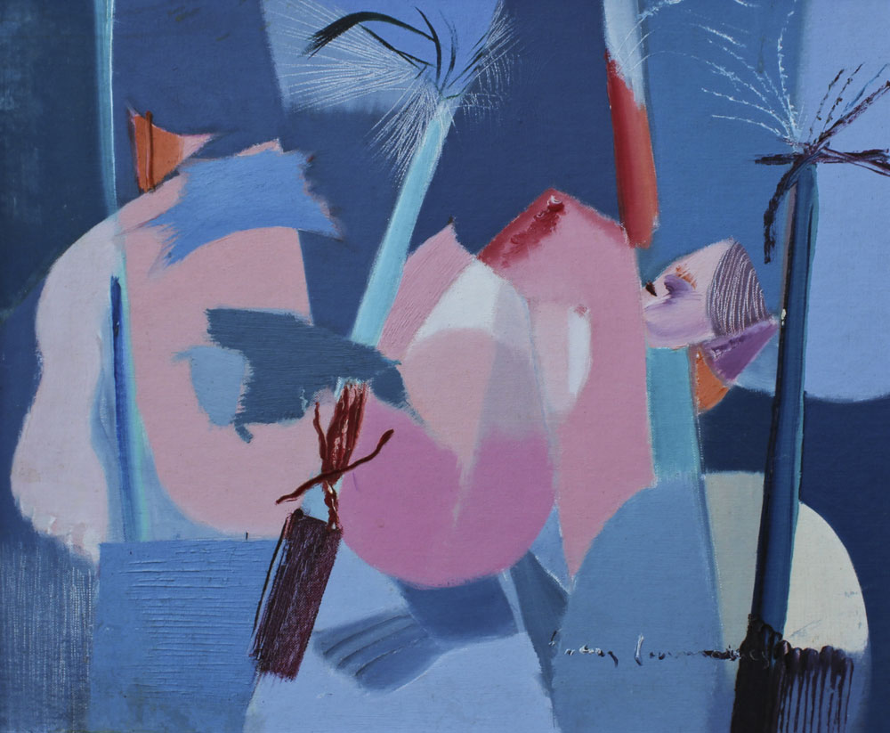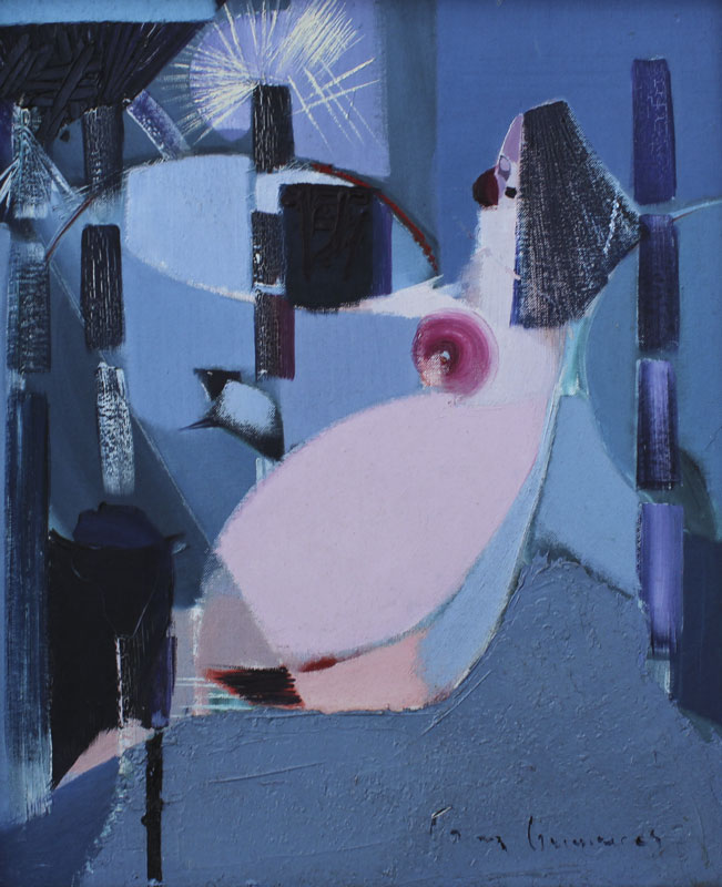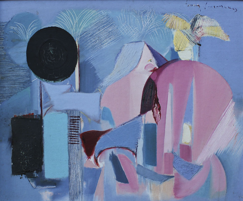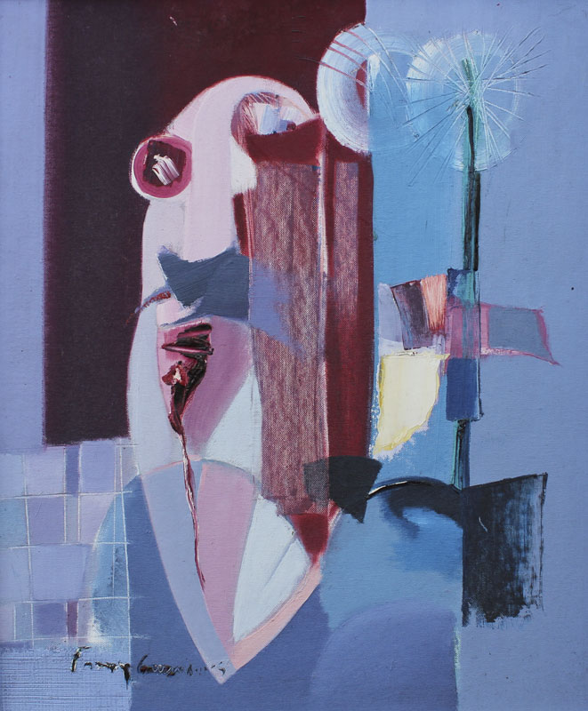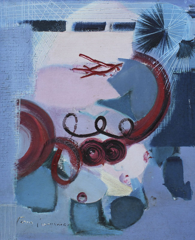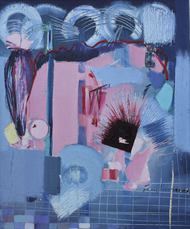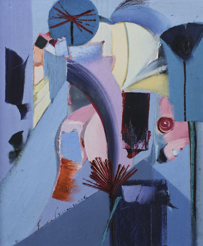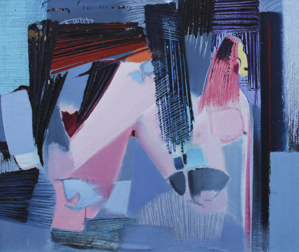 GUIMARAES, Franz, (Brazilian, 20th C.): 8 pc abstract nude series, OIL/Canvas Board, 20'' x 24'' or 24'' x 20'', encased in custom brushed aluminum frames, 25'' x 21''. Jon Corbino Galleries label verso on one picture, with original price of $600, titled Dancer.