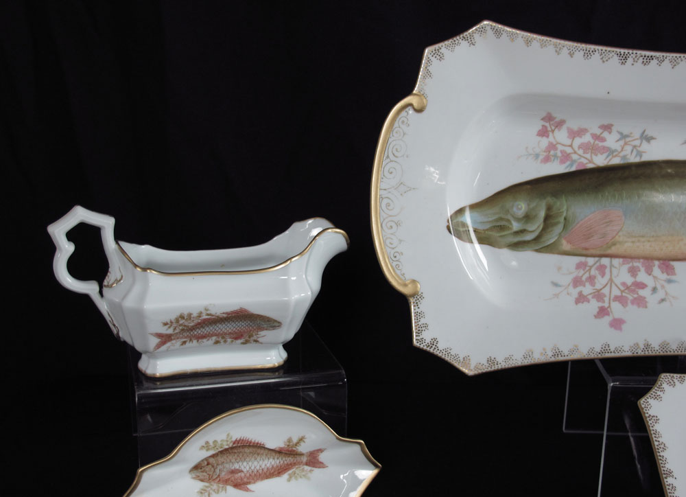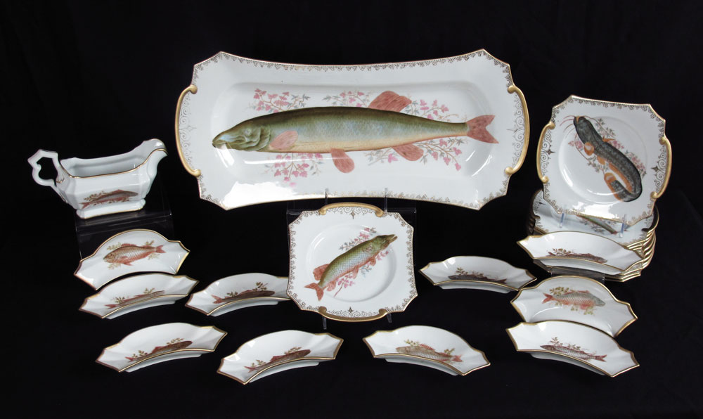AUSTRIAN FRIEDA CHINA FISH SET: Hand decorated and gilded edges, 23 piece set to include the platter (21 5/8'' x 10 1/8''), 10 bone dishes (7 1/8'' x 3''), 11 plates (8'' square), and the sauce boat (4 3/4'' x 8 1/2'').