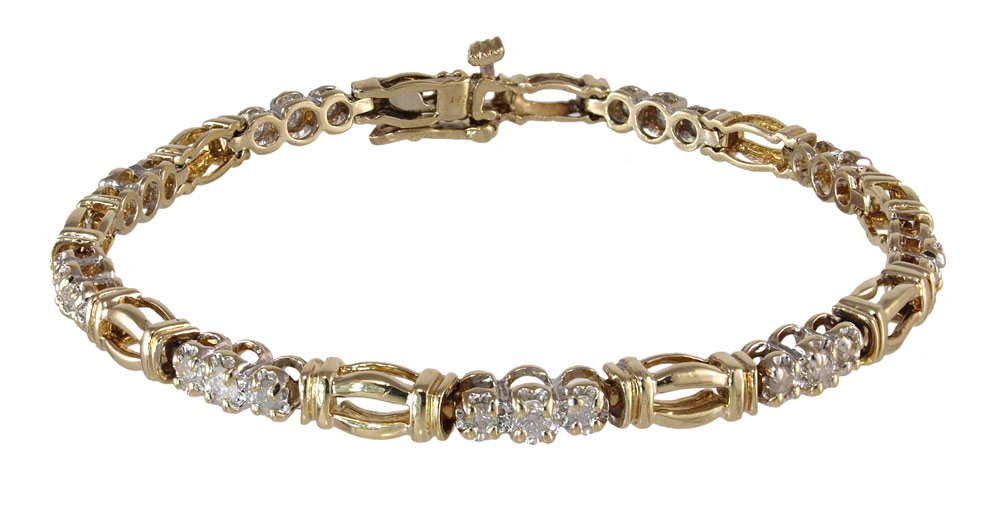 DIAMOND TENNIS BRACELET: 10K yellow gold bracelet contains 27 round full cut diamonds totaling approx. .75 Ct. Rated I1-I2 in clarity and I-J in color. The diamonds are prong set. Figure eight safety clasp. Weight: 7.9 grams Length. 6.75''.