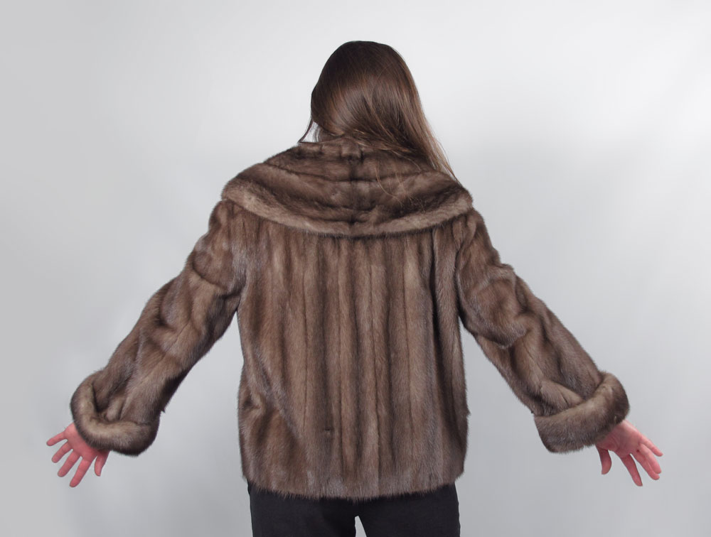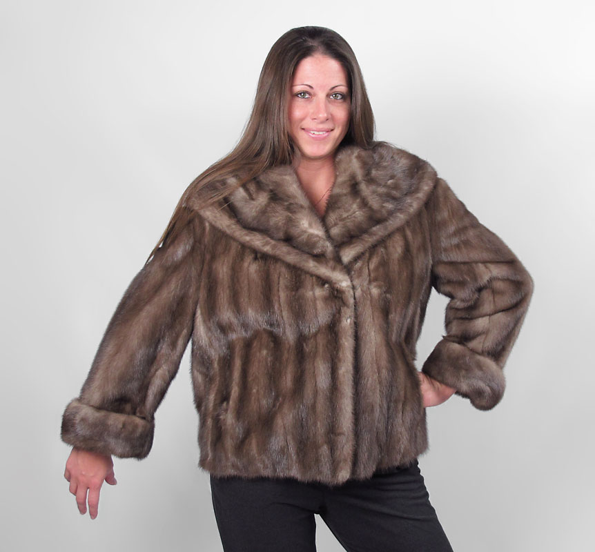 PLUSH FUR JACKET: Soft brown jacekt with a wide collar lapel. Schroeders & Taylor label. Approx. 25''L. Medium size.