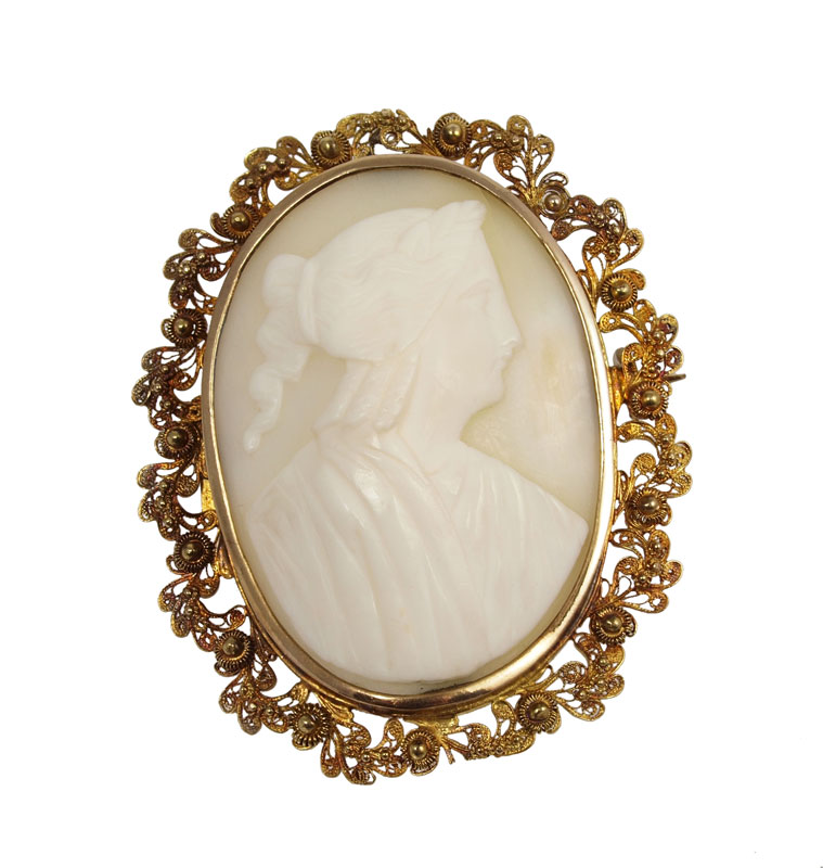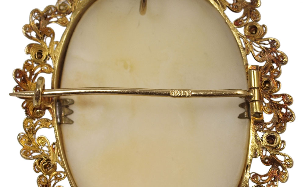 A LARGE 18K CAMEO BROOCH: 18K yellow gold brooch with one 40.00 x 30.00 mm shell cameo depicting a Georgian lady. Bar pin closure. Bail has been added. Weight: 17.2 grams.