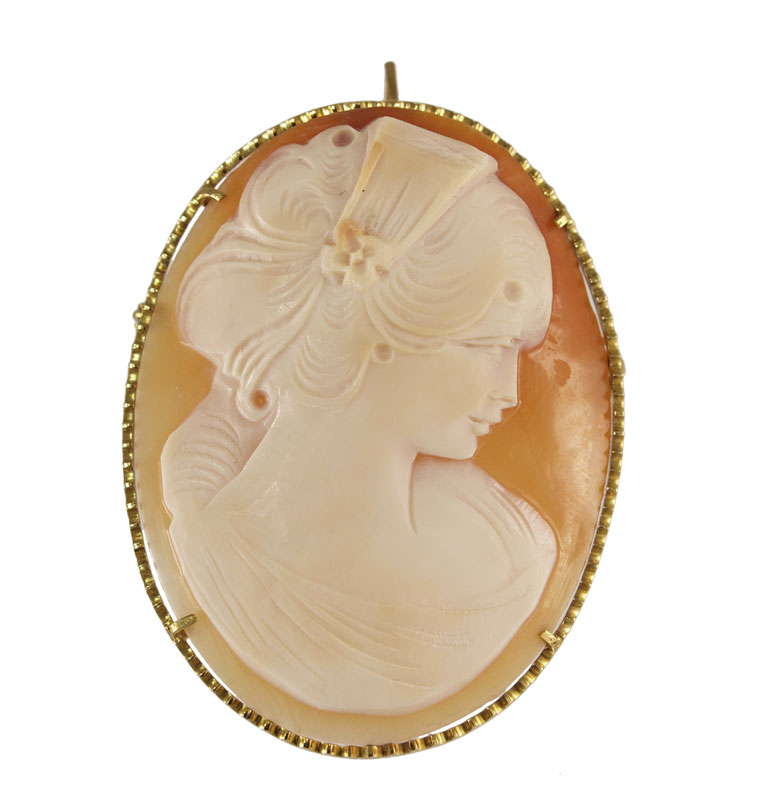 18K CAMEO BROOCH: 18K yellow gold frame contains one 50.00 x 40.00 mm shell cameo depicting a Victorian lady. Bar pin and bail. Gold weight: 4.0 grams approx.