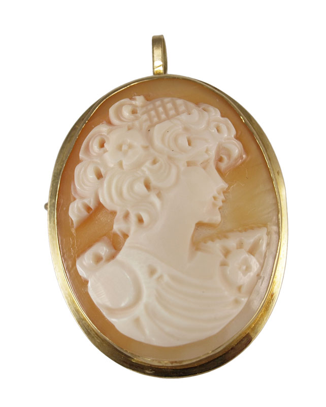 18K CAMEO BROOCH: 18K yellow gold frame contains one 35.00 x 25.00 mm shell cameo depicting a Victorian lady. Bar pin and pivot bail. Gold weight: 2.5 grams approx.