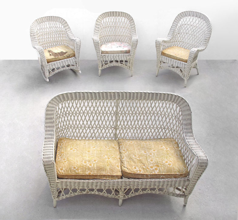 4 PIECE BAR HARBOR WICKER SUITE: Very sturdy set, of the period. To include SETTEE 36'' h. x 57 1/4'' x 29'', ROCKER 34 1/2'' h. x 32'' x 28 1/2'', arm CHAIR 39 1/4'' h. x 27 3/4'' x 27 1/2'', arm CHAIR 35 1/2'' h. x 28'' x 25 1/2''.