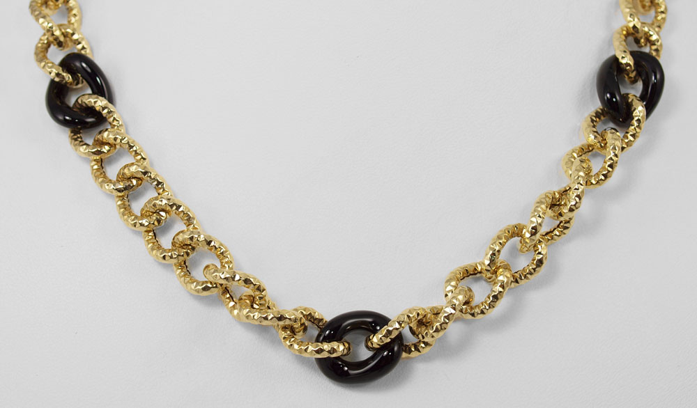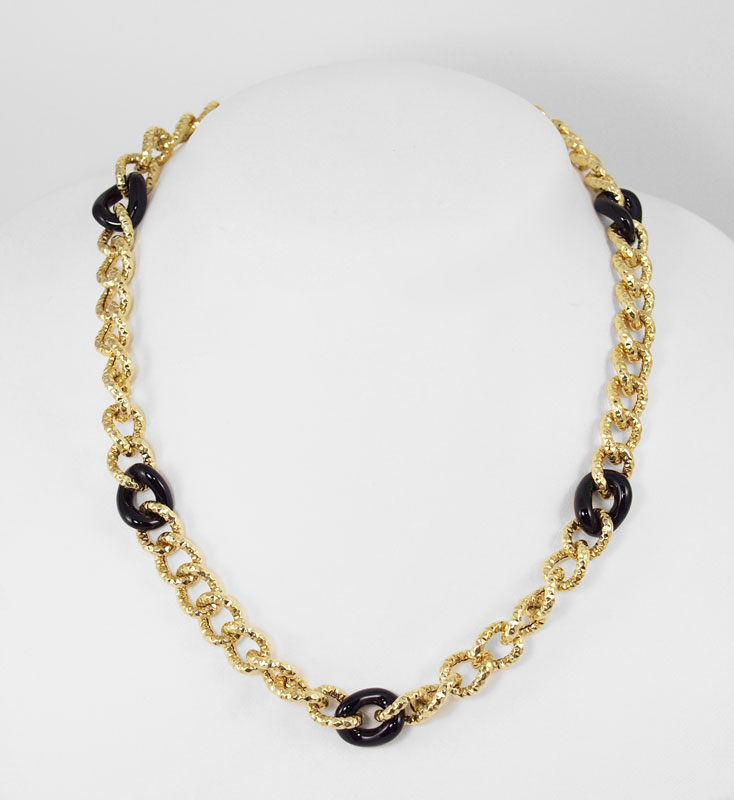 TWO 14K GOLD AND ONYX NECKLACES: 14K yellow gold fancy link chains. One has 7.00 mm onyx beads and measures 24''. One has onyx links and measures 16''. Weight: 34.0 grams.