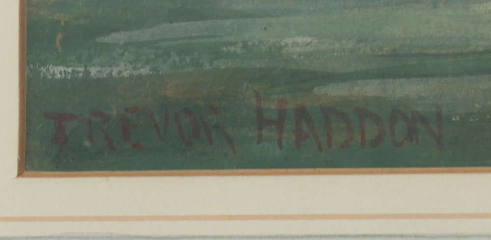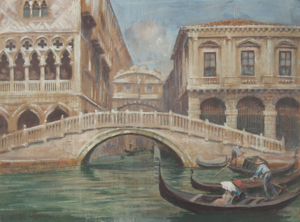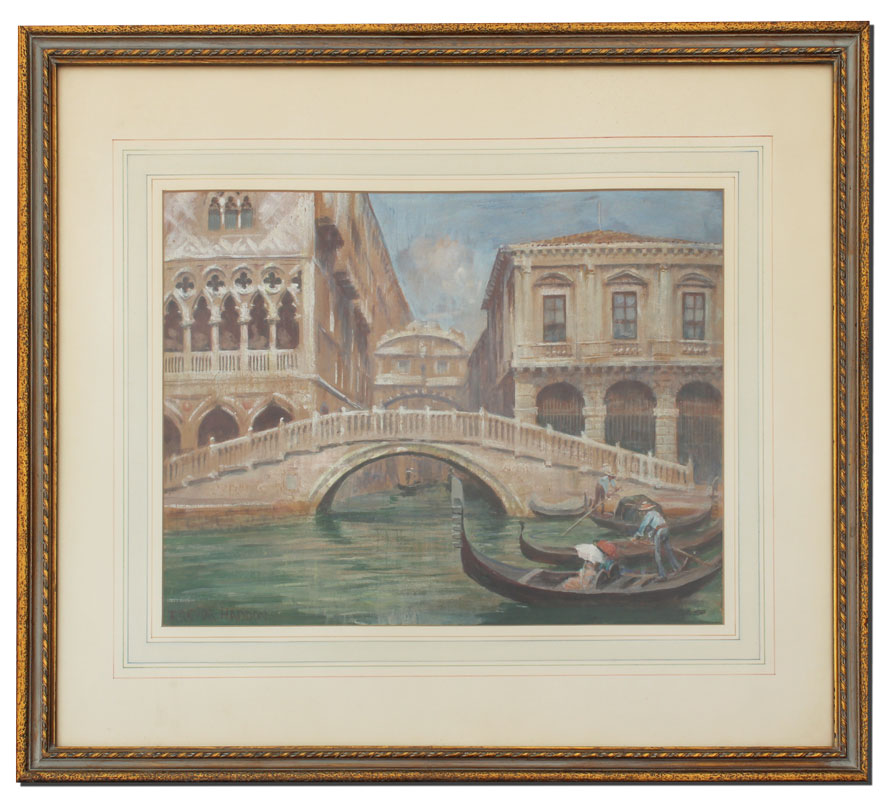 HADDON, Arthur Trevor, (British, 1864-1941): Venetian Canal Scene with Gondoliers, Watercolor and Gouache, sight size 11 1/2'' x 15 1/2'', signed lower left, encased in gilded frame with hand-painted mat, 20'' x 24''.