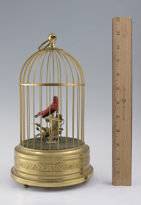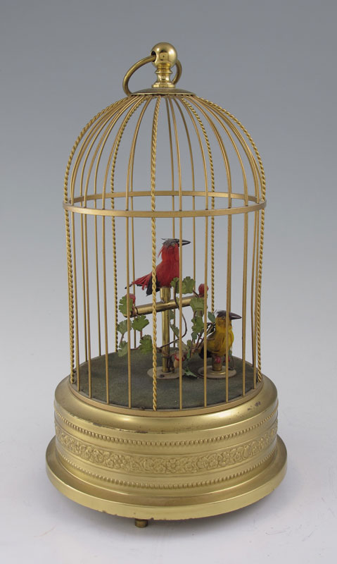 SINGING BIRD AUTOMATON: Two birds in a brass cage. Winding sets the feathered birds into action. In good working order. Marked Germany. 11 1/4'' h. x 6 3/4''.