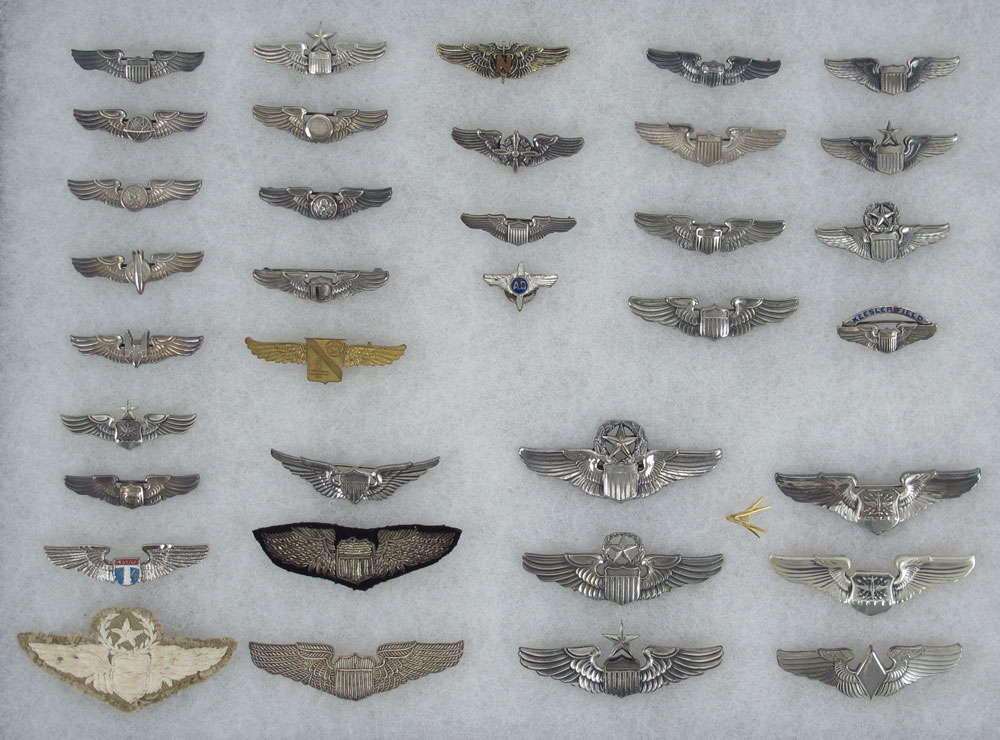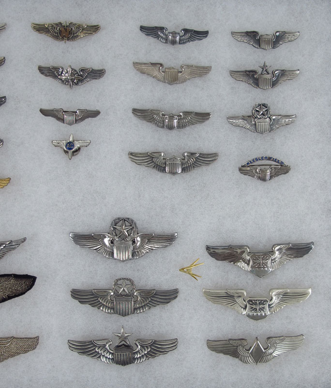 COLLECTION OF STERLING & OTHER AVIATOR WINGS: To include 1) Approx. 25 2'' wings of which 19 are sterling. Wings to include Pilot, Senior Pilot, Navigator, Gunner, Bomber, Service Pilot Liaison Pilot, Nurse, Kessler Field pin and more. 2) AC propeller pin. 3) 6 3'' wings of which 5 are sterling to include Command Pilot, Senior Pilot, post war pilot, WASP class diamond center wings. 4) 3 Bouillon patches of which 2 are silver thread.