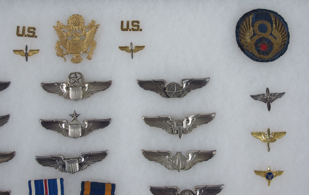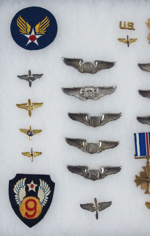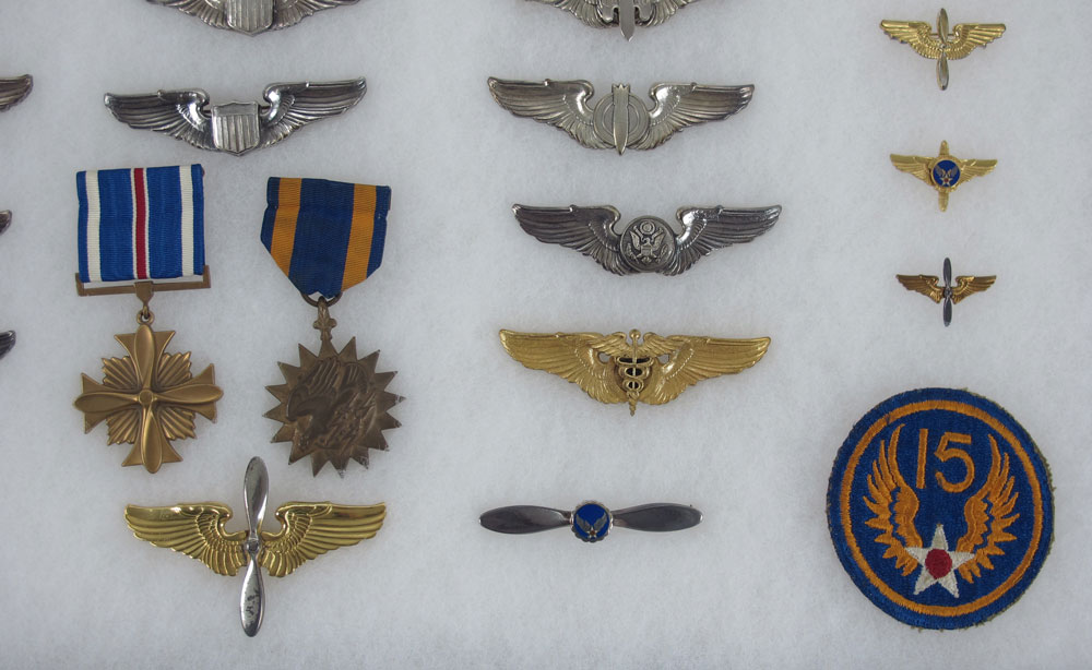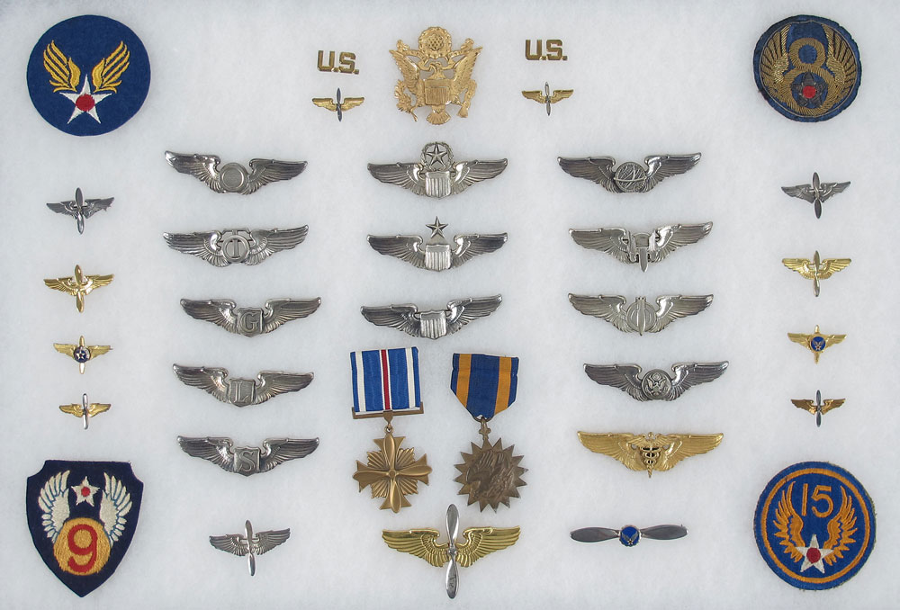 COLLECTION OF STERLING AVIATION WINGS, PATCHES AND PINS: To include 1) 13 3'' wings to include Observer, Technical Observer, Glider Pilot, Liaison Pilot, Service Pilot, Command Pilot, Senior Pilot, Pilot, Navigator, Gunner, Bomber, Air Crew member, gold toned Flight Surgeon. Most are American Emblem manufacture. 2) Air Medal and Distinguished Flying Cross. 3) 12 Air Corp pins ranging from 1 1/2'' to 3'', assorted makers. 4) Hat Badge and US lapel pins. 5) 4 Patches to include Army Air Force, 9th United Kingdom, 8th United Kingdom bouillon, 15th, Italy.