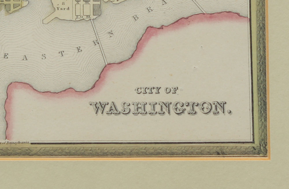 1836 TANNER MAP OF WASHINGTON D.C.: Hand colored copper engraving of Washington D. C., published 1836 by H. S. (Henry Schenck) Tanner. Sight size 12'' x 15'', matted and framed under glass, 18 3/8'' x 21 1/2''.