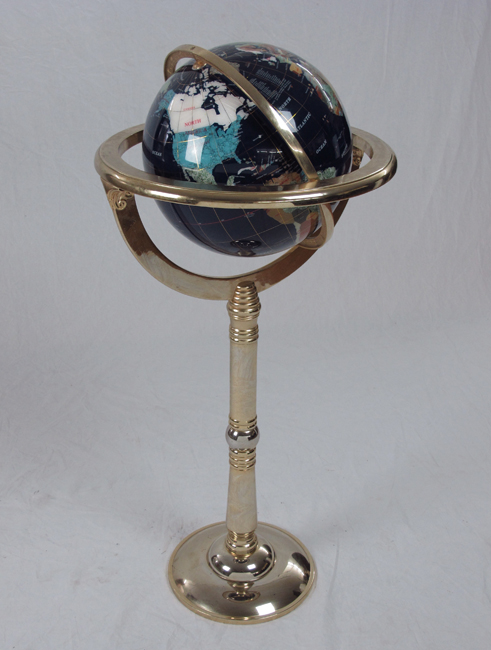 SEMI PRECIOUS GEMSTONE INLAY GLOBE ON BRASS STAND: Globe measures approx. 12'' dia. Stands 14'' tall, 18'' wide overall.
