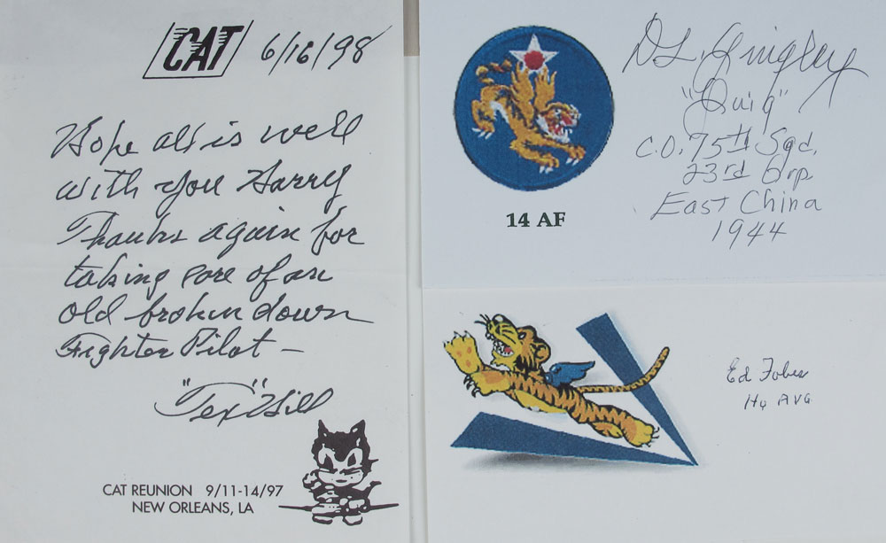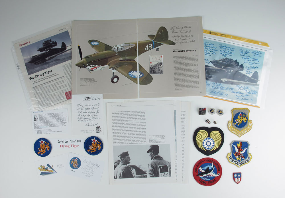 COLLECTION OF FLYING TIGERS MEMORABILIA: To include 1) David Lee ''Tex'' Hill signed note and signed article. 2) DL Quigley autographed card. 3) Ed Fobes autographed card. 4) 7 patches to include 14th Air Force, 75th Tactical fighter squadron, 23rd Tactical Fighter Wing and others. 5) 5 pins.