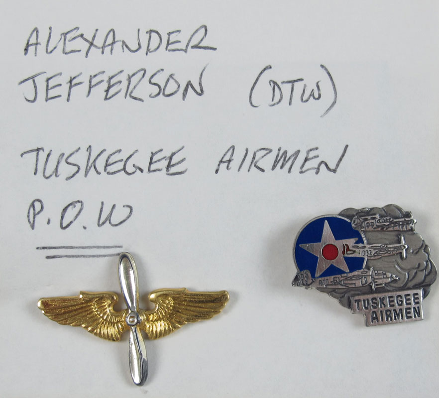 ALEXANDER JEFFERSON TUSKEGEE P.O.W. AVIATION PINS: To include gold tones 1 1/8'' insignia propeller wings and Tuskegee airmen pinback. Lt. Col. Jefferson was shot down over Southern France in 1944 and remained in a prisoner of war camp until 1945.