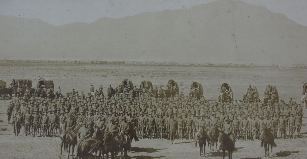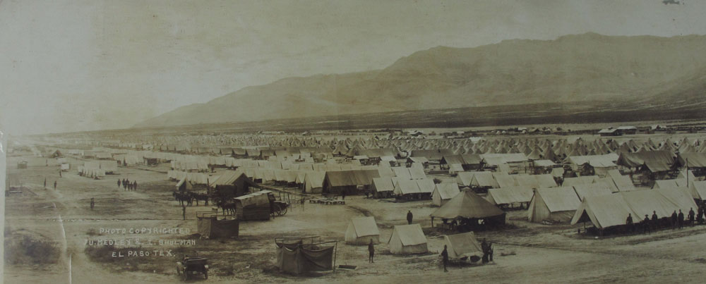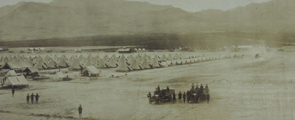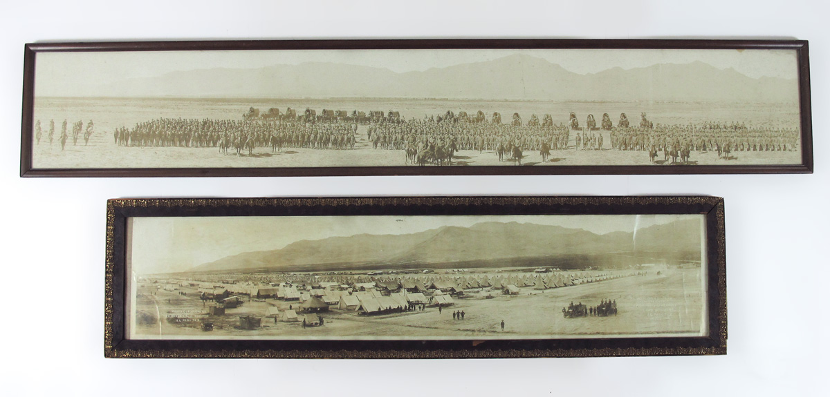 PAIR WWI EL PASO LARGE FORMAT MILITARY PHOTOS: To include 1) 1916 dated, Pennsylvania Division, 16th Regiment Camp Stewart El Paso by Medley & Shulman. Sight size 46'' x 9 3/4'', framed 13'' x 49 1/2''. 2) Unknown Camp Steart El Paso regiment by Medley & Shulman, 9 1/2'' x 62 3/4'', framed 11 1/4'' x 64 1/2''.