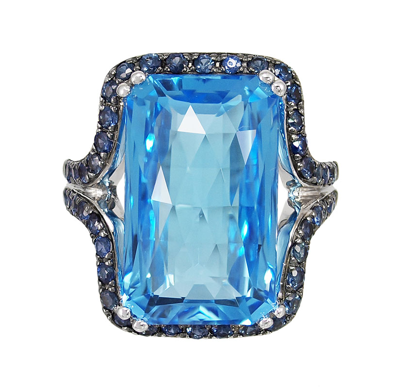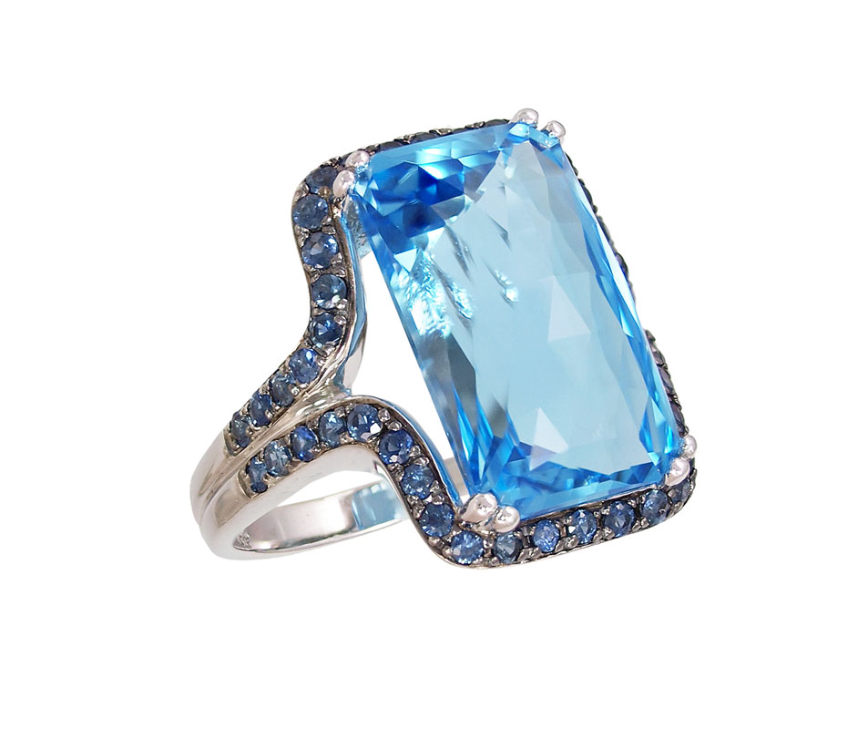 10K TOPAZ & SAPPHIRE RING: 10K white gold ring contains one cushion fantasy cut ''Swiss'' blue topaz, approx. 12.00 Ct. and 48 round mixed cut blue sapphires of unknown origin, approx 1.00 Ctw. The topaz and sapphires are prong set. Weight: 9.1 grams. Size: 7