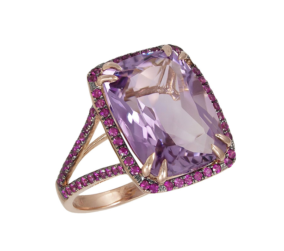 AMETHYST AND PINK SAPPHIRE RING: 10K rose gold ring contains one cushion cut amethyst, approx. 10 Ct. On the shank and framing the amethyst are 81 round mixed cut pink sapphires totaling approx. 1.00 Ct. The amethyst and sapphires are prong set. Weight: 5.1 grams. Size: 8.