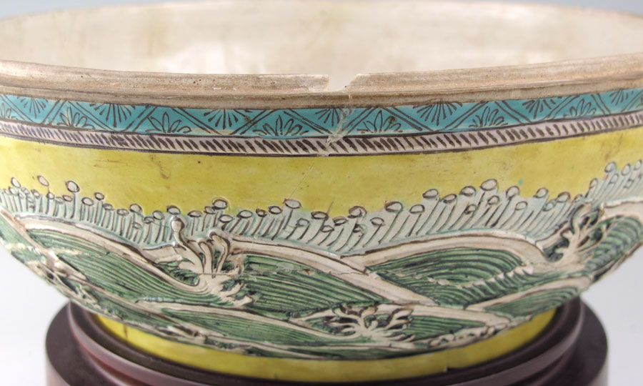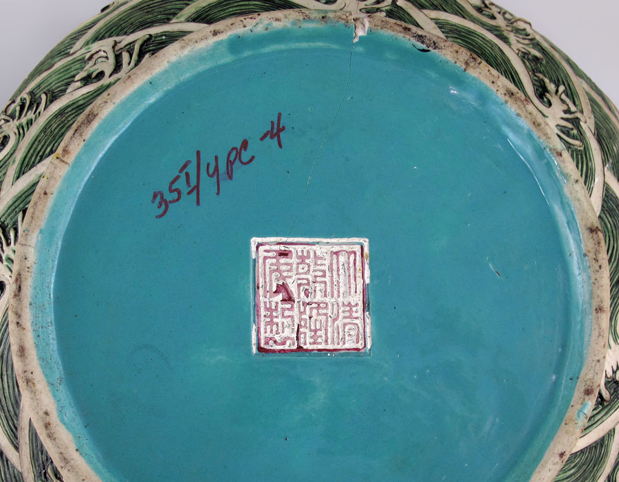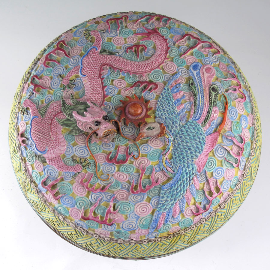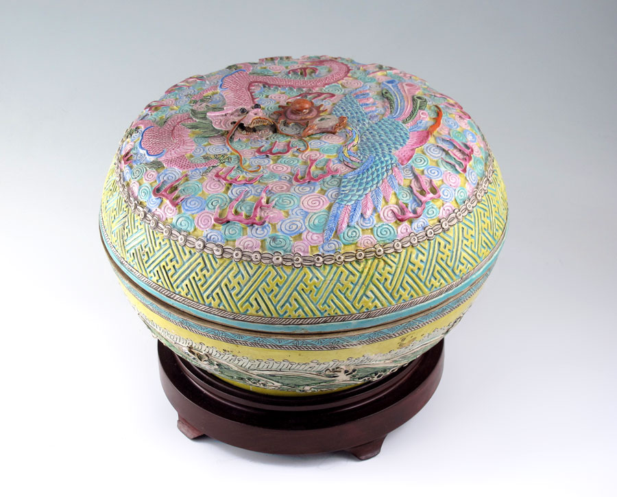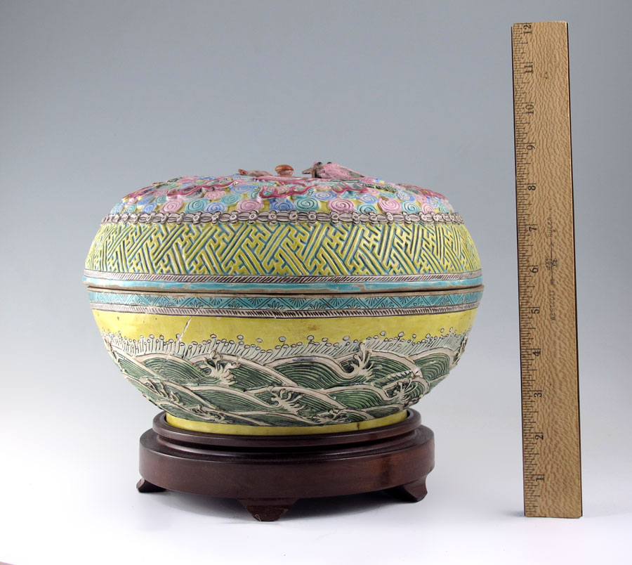 POLYCHROME CHINESE EARTHENWARE DRAGON COVERED BOWL: Relief dragon with figural bird lid. Impressed signature on base and later marked 35I/4PC-4. Measures 7'' h. x 10 1/2''. Sold with wood stand, 2'' h. x 8 1/4'' dia.