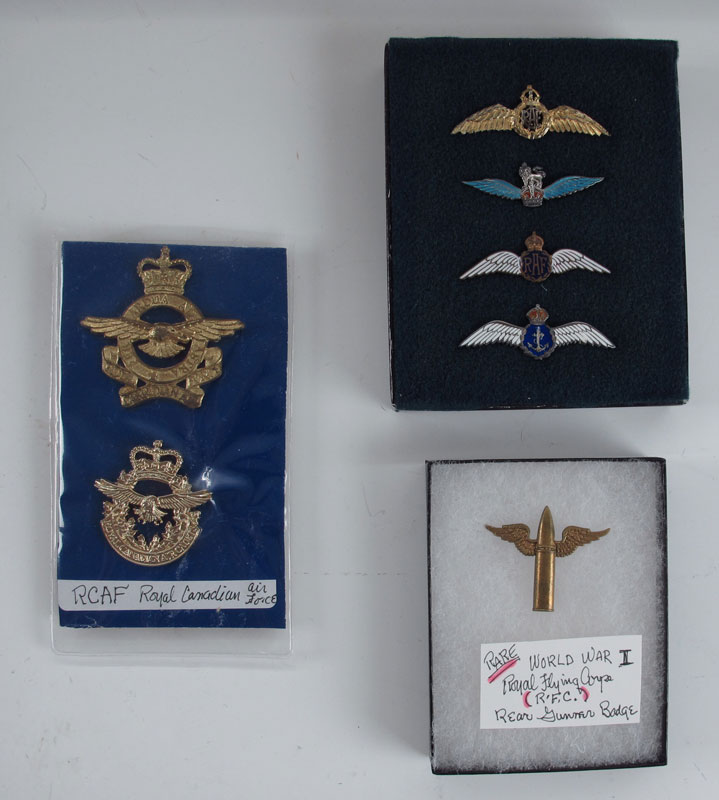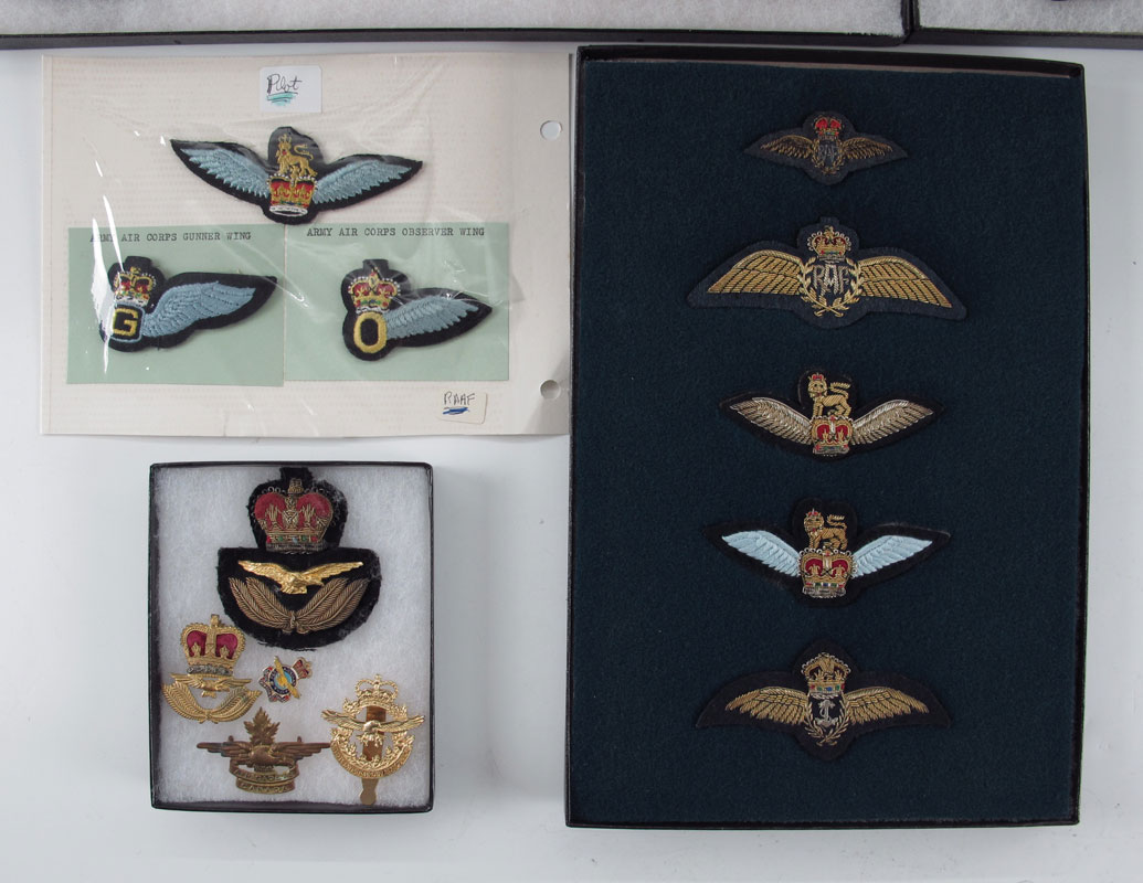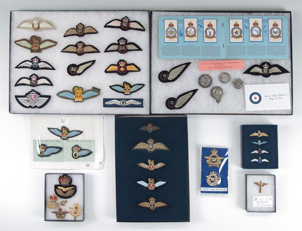 COLLECTION OF RAF & RCAF AVIATION MEMORABILIA: Approx. 43 wings, patches, bullion an related items including a complete Imperial Tobacco Co. set of cigarette insignia cards in book. Collection in 6 riker mounts and 3 cards.