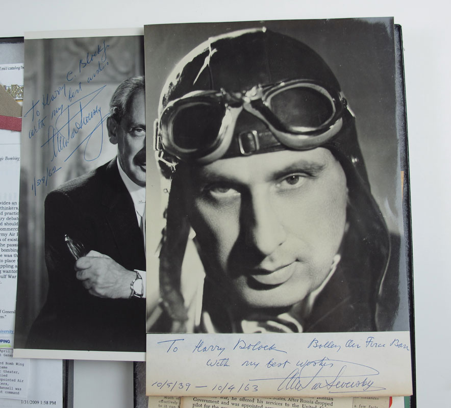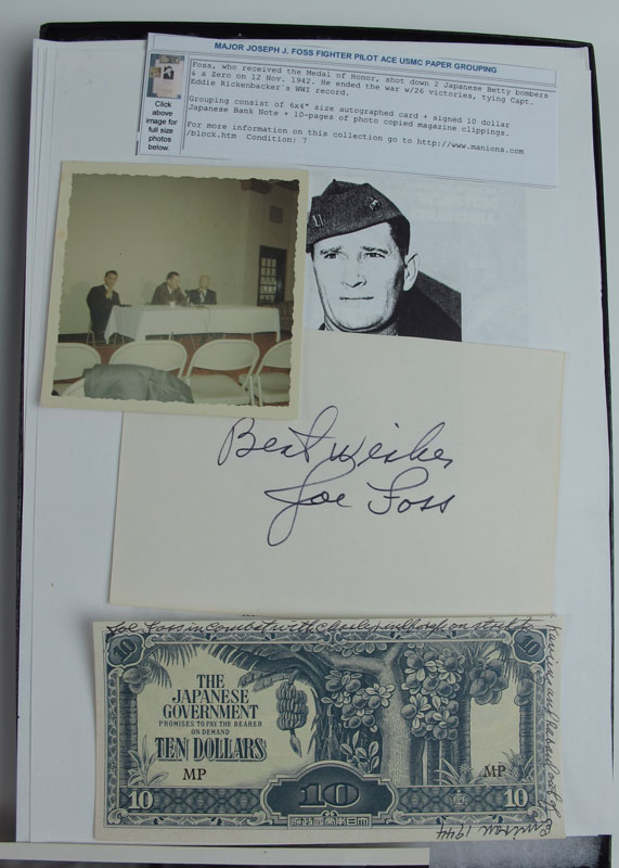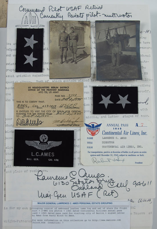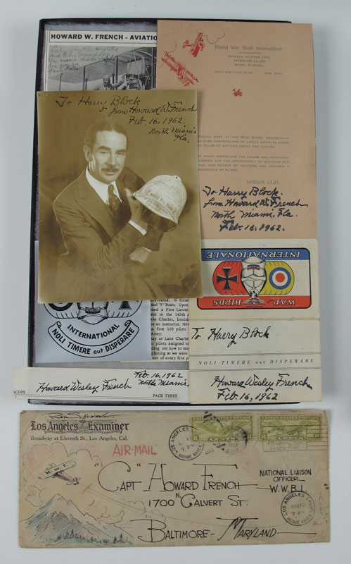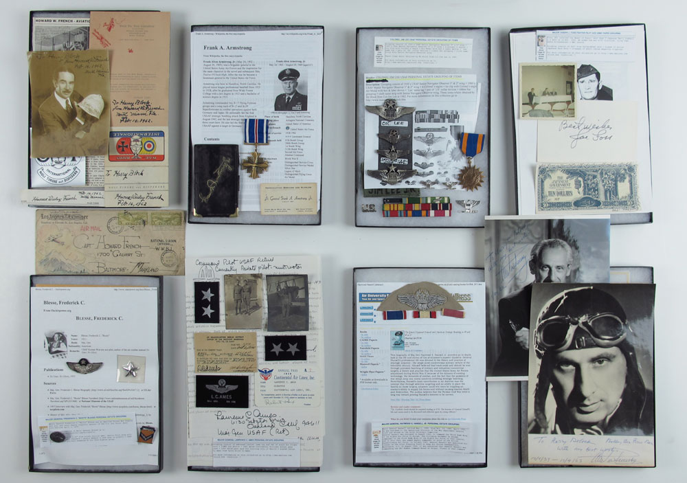 COLLECTION OF FLYING ACES MEMORABILIA: All mounted in riker mounts to include 1) Howard French, World War I ace signed photo, place card and related items. 2) Major General Fredrick ''Boots'' Blesse, Korean War ace and author of ''No Guts, No Glory'' Silver Star, bullion patch, button, pin. 3) Major General Lawrence Ames photographs, signed letter, leather name tag and stars and related items. 4) Lt. General Frank Armstrong distinguished Flying Cross and billfold. 5) Colonel Jim Lee wings, Air medal, Colonel eagles, ribbon bar, name patch and US pin. 6) Major General Haywood Hansel bullion wings. 7) Major General Joseph Foss signed card and signed $10 bank note. 8) Alexander Seversky signed photo, signed paper and related items.