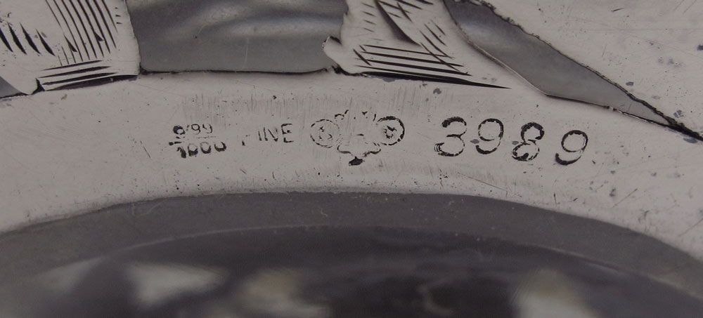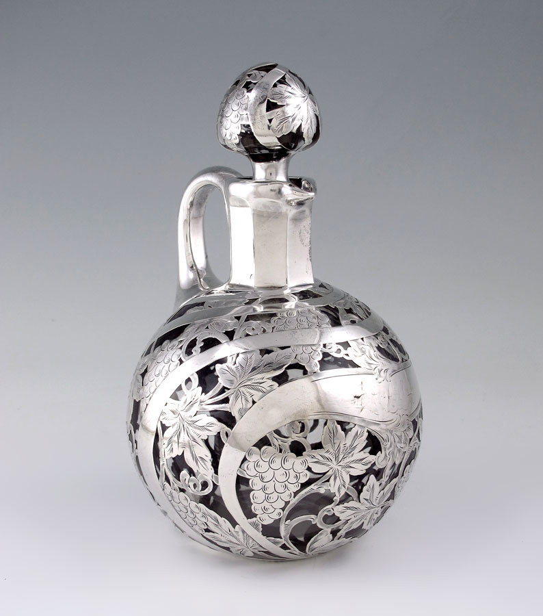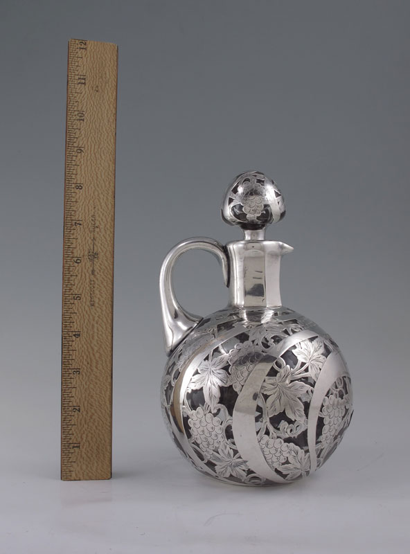 ALVIN FINE SILVER OVERLAY DECANTER: Clear glass ships decanter with grape vine motif. Alvin fine silver 999/1000 overlay with matching stopper. Marked on bottom. Evidence of prior monogrammed, not yet completely removed. 8 1/2'' h. x 5'' dia.
