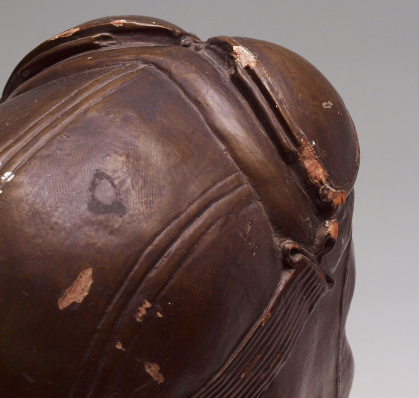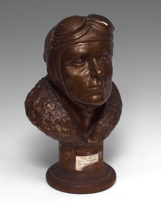 TERRA COTTA BUST OF CHARLES NUNGESSER FLYING ACE: Bronzed finish terra cotta sculpture of Charles Nungesser, World War I flying ace for France. 43 documented victories, 2 undocumented. On wood plinth. Overall measures 19'' h. x 11 1/2'' x 9 3/4''.