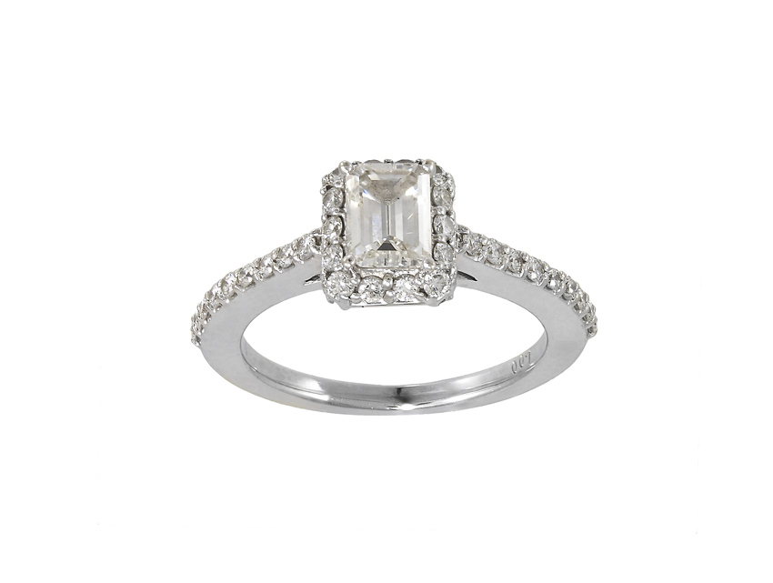 18K EMERALD CUT DIAMOND RING: 18K white gold ring contains one emerald cut diamond. Weight: .59 Ct. Approx. Rated VS2 in clarity and I in color. 32 round brilliant cut diamonds. Weight: .41 Ct. Approx. Rated VS in clarity and G-H in color. The diamonds are prong set. Weight: 3.8 grams Size: 5.25