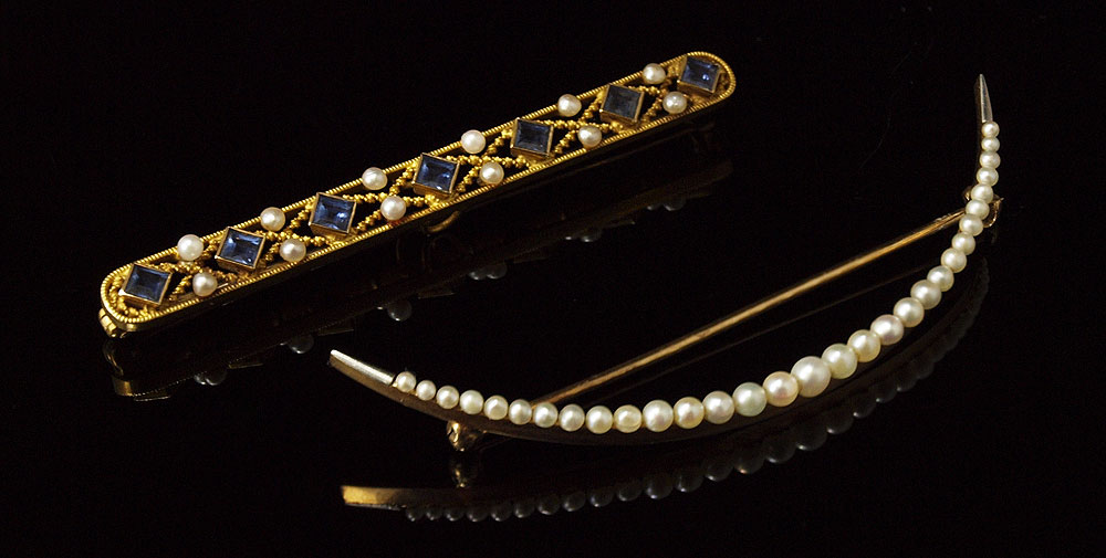 2 ANTIQUE GOLD SEED PEARL PINS: 1) 14K seed pearl crescent pin, 3''length. 2) 14K sapphire and seed pearl bar pin. The sapphire weight is approx., .85 Ct. Length, 2.5''. Weight: 10.0 grams.