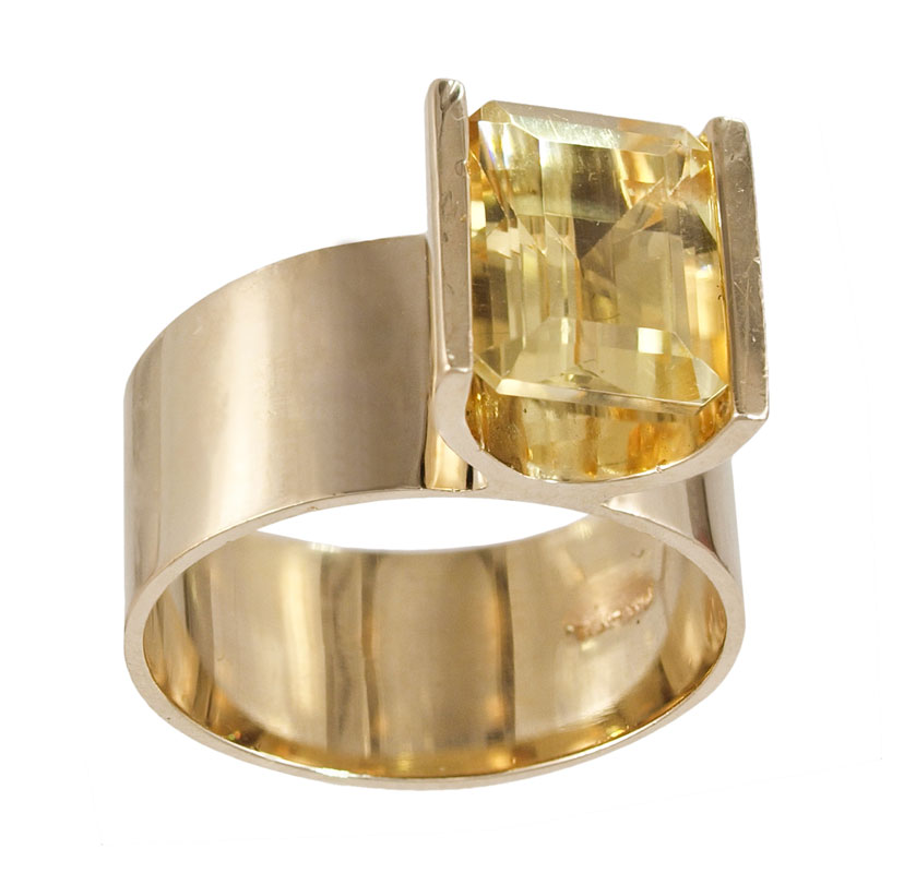 14K CITRINE RING: 14K yellow gold ring contains one emerald cut citrine. Weight: 2.50 Ct. Approx. The citrine is channel set. Weight: 6.3 grams. Size: 5.5