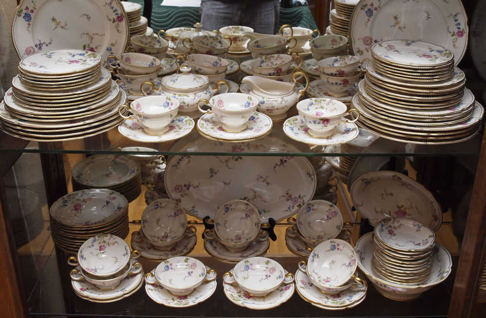 FINE CZECHOSLOVAKIAN CHINA SERVICE: Approx. 103 pieces in a floral motif to include 10 plates (10 3/4''), 7 salad, 12 bread, 11 teacups, 12 saucers, covered sugar, open creamer, 10 bowls, 12 small bowls, 12 handled soup bowl with 12 underplates, serving bowl, platter (15 3/4'' x 10 3/4''), oval bowl. Unmarked.