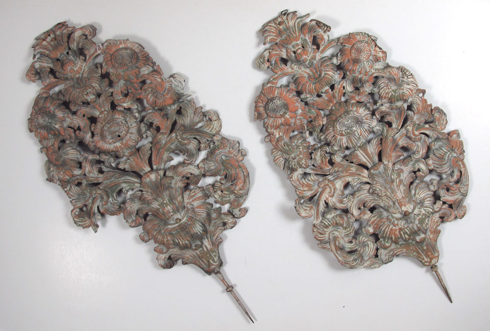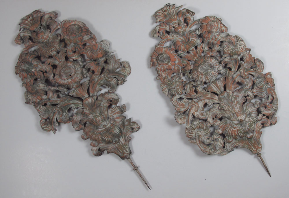 2 METAL FLORAL GARDEN DECORATIONS: Cast and pressed metal in th form of flowers with spikes at base for insertion into soil. Measures 38 1/2'' h. x 20 1/2''.